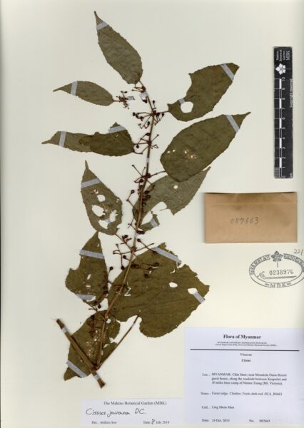 | Notes | Deciduous forest, dry arid zone. Climber. Fruits dark. JICA_R0874 | ||||