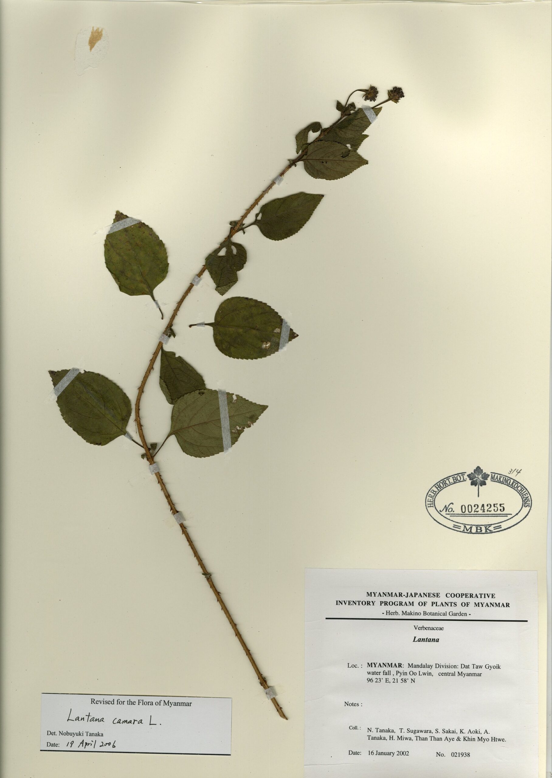 Verbenaceae | Lantana camara L. | MYANMAR: Mandalay Division: Dat Taw Gyoik water fall , Pyin Oo Lwin, central Myanmar. | 16 January 2002 | N. Tanaka, T. Sugawara, S. Sakai, K. Aoki, A. Tanaka, H. Miwa, Than Than Aye & Khin Myo Htwe.; | 021938 | 0024255 |