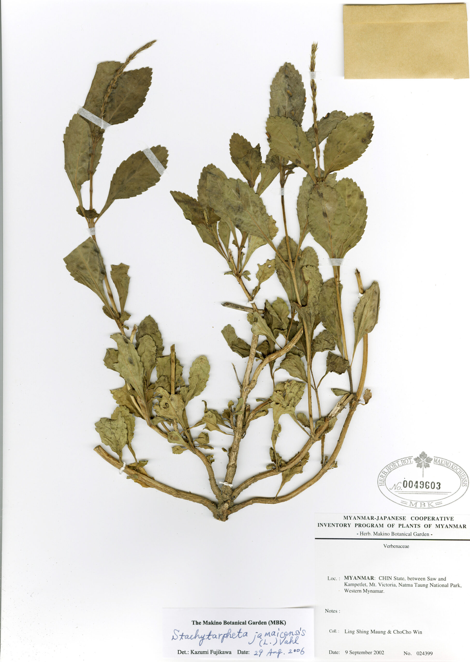 Verbenaceae | Stachytarpheta jamaicensis (L.) Vahl | MYANMAR: CHIN State, between Saw and Kampetlet, Mt. Victoria, Natma Taung National Park, Western Myanmar. | 9 September 2002 | Ling Shing Maung & Cho Cho Win; | 024399 | 0049603 |