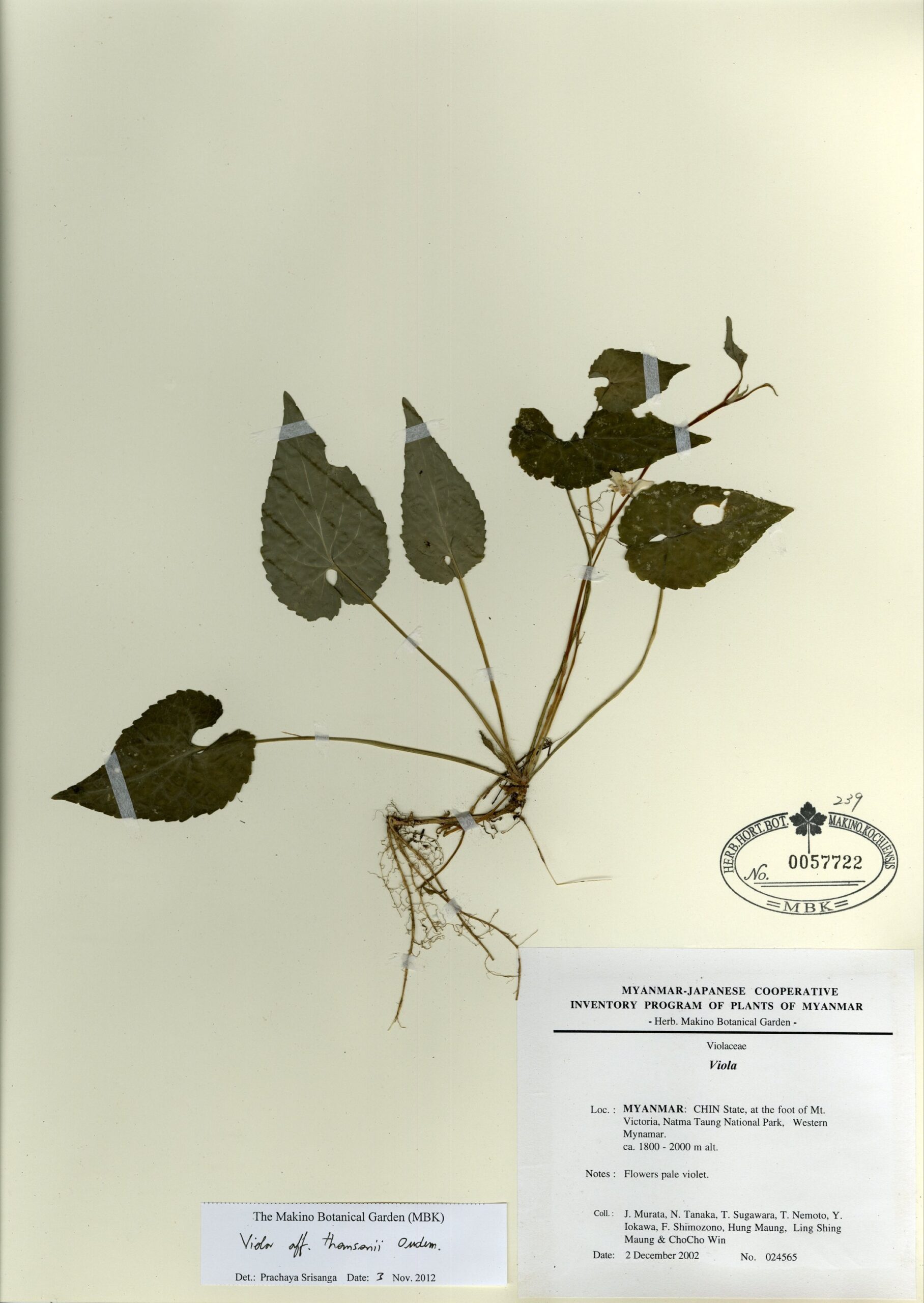 Violaceae | Viola aff. thomsonii Oudem. | MYANMAR: CHIN State, at the foot of Mt. Victoria, Natma Taung National Park, Western Myanmar. | 2 December 2002 | J. Murata, N. Tanaka, T. Sugawara, T. Nemoto, Y. Iokawa, F. Shimozono, Hung Maung, Ling Shing Maung & Cho Cho Win; | 024565 | 0057722 |