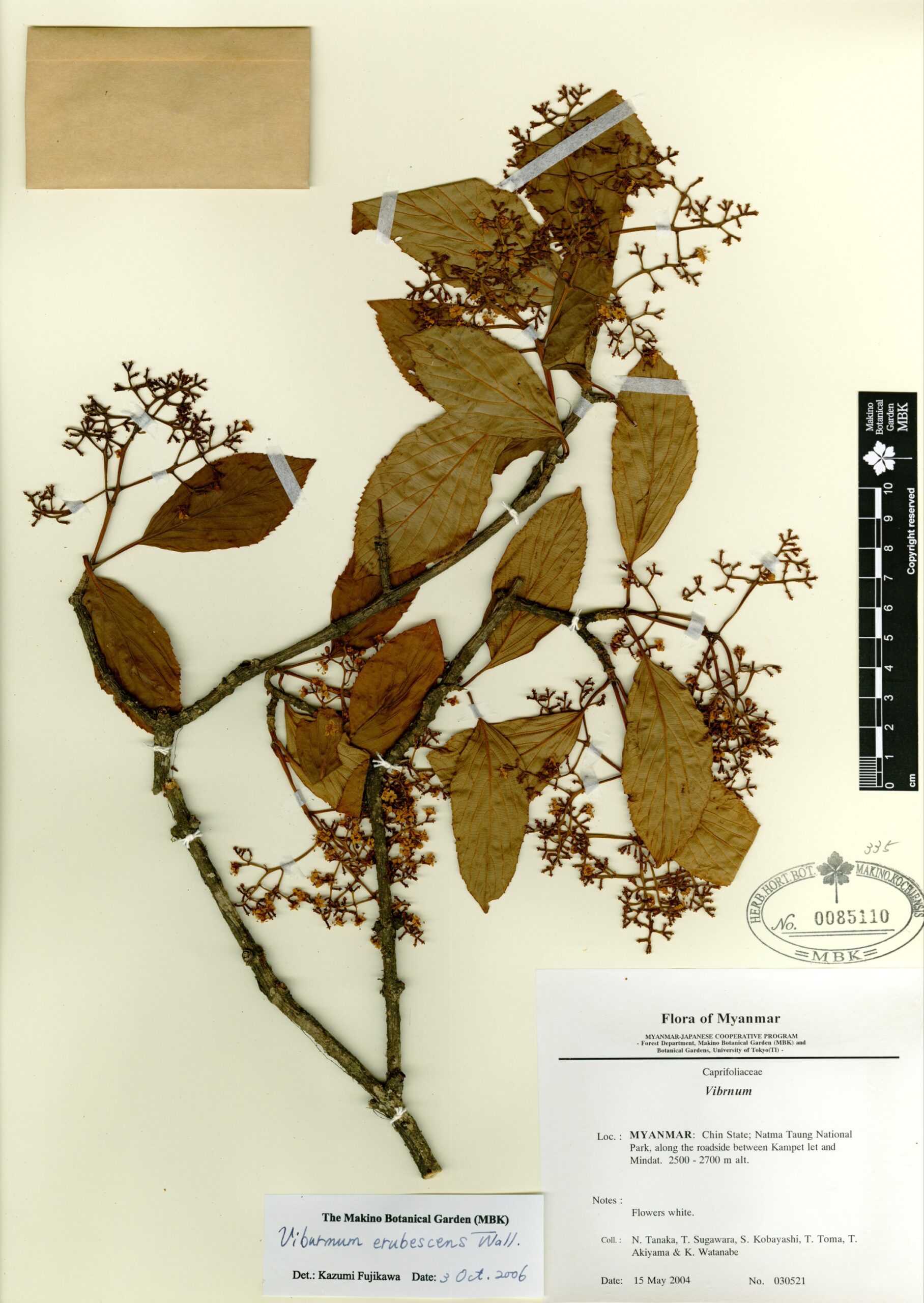 Viburnaceae | Viburnum erubescens Wall. | MYANMAR: Chin State; Natma Taung National Park, along the roadside between Kanpetlet and Mindat. | 15 May 2004 | N. Tanaka, T. Sugawara, S. Kobayashi, T. Toma, T. Akiyama & K. Watanabe; | 030521 | 0085110 |