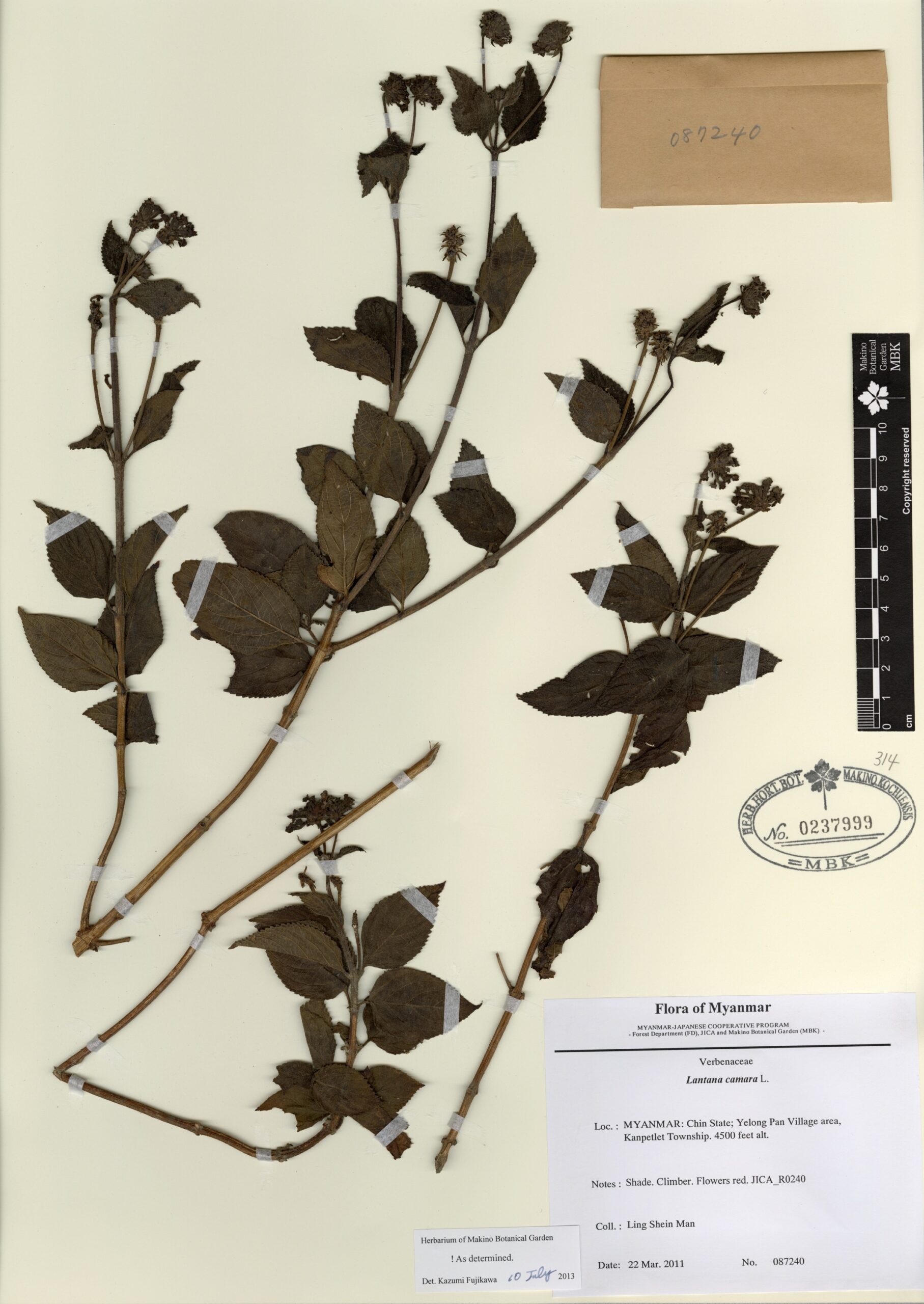 Verbenaceae | Lantana camara L. | MYANMAR: Chin State; Yelong Pan Village area, Kanpetlet Township. | 22 March 2011 | Ling Shein Man; | 087240 | 0237999 |