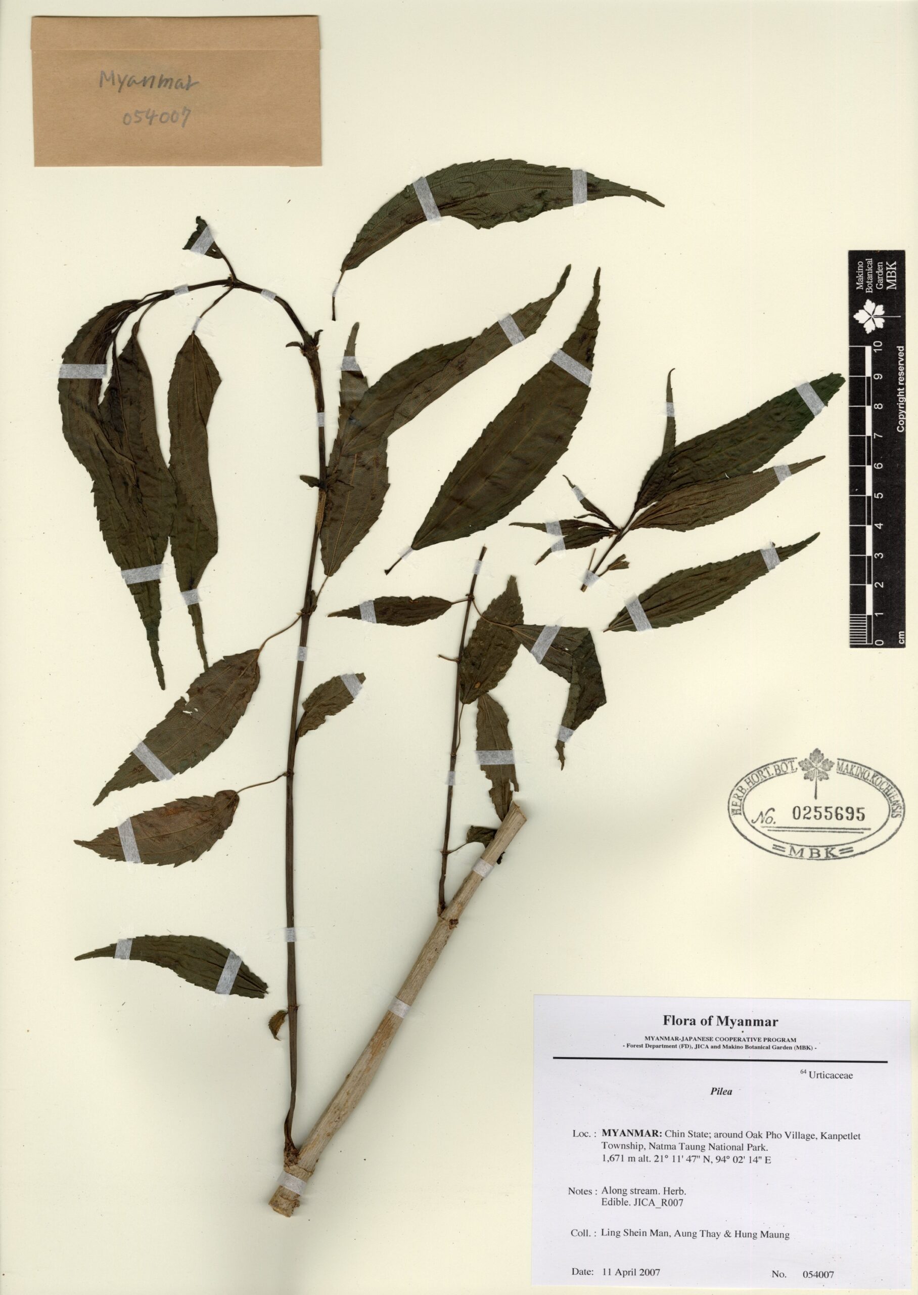 Urticaceae | Pilea | MYANMAR: Chin State; around Oak Pho Village, Kanpetlet Township, Natma Taung National Park. | 11 April 2007 | Ling Shein Man, Aung Thay & Hung Maung; | 054007 | 0255695 |