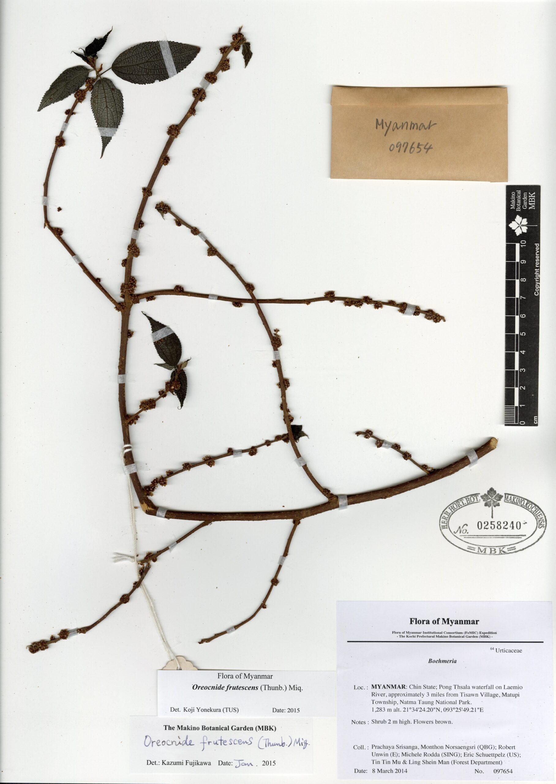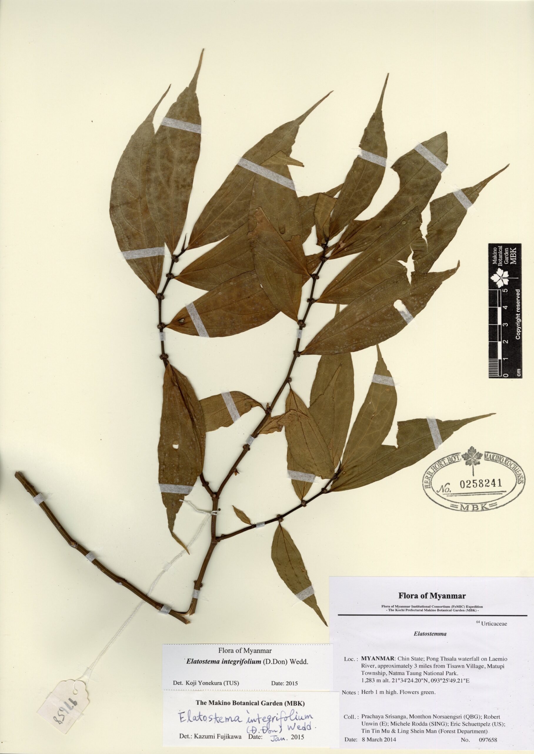 Urticaceae | Oreocnide frutescens (Thunb.) Miq. | MYANMAR: Chin State; Pong Thsala waterfall on Laemio River, approximately 3 miles from Tisawn Village, Matupi Township, Natma Taung National Park. | 8 March 2014 | Prachaya Srisanga, Monthon Norsaengsri (QBG); Robert Unwin (E); Michele Rodda (SING); Eric Schuettpelz (US); Tin Tin Mu & Ling Shein Man (Forest Department); | 097654 | 0258240 |