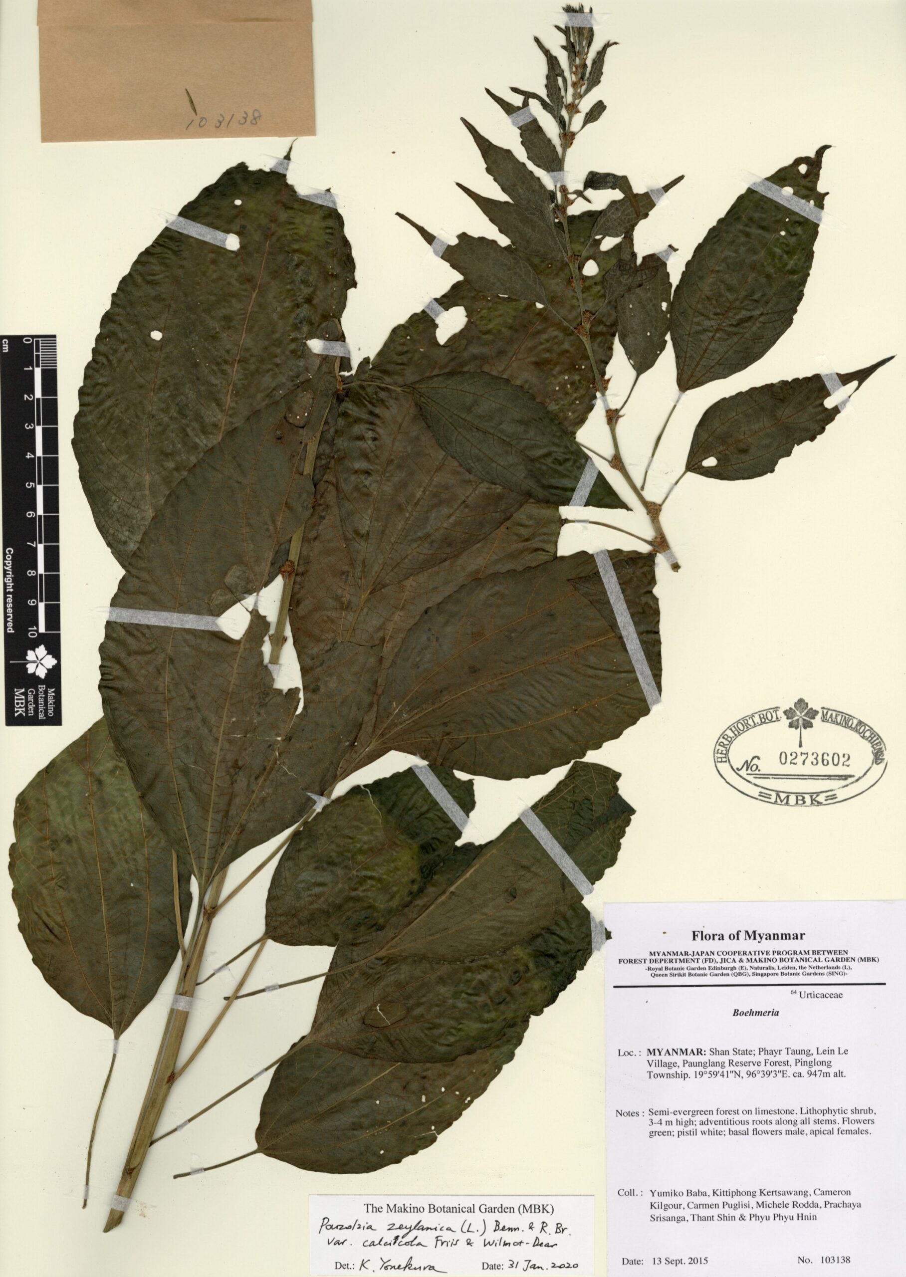 Urticaceae | Elatostema cyrtandrifolium (Zoll. & Moritzi) Miq. | MYANMAR: Shan State; along the road between Phogone Village and Pinglong, Paunglang Reserve Forest, Pinglong Township. | 14 September 2015 | Yumiko Baba, Kittiphong Kertsawang, Cameron Kilgour, Carmen Puglisi, Michele Rodda, Prachaya Srisanga, Thant Shin & Phyu Phyu Hnin; | 103197 | 0273606 |