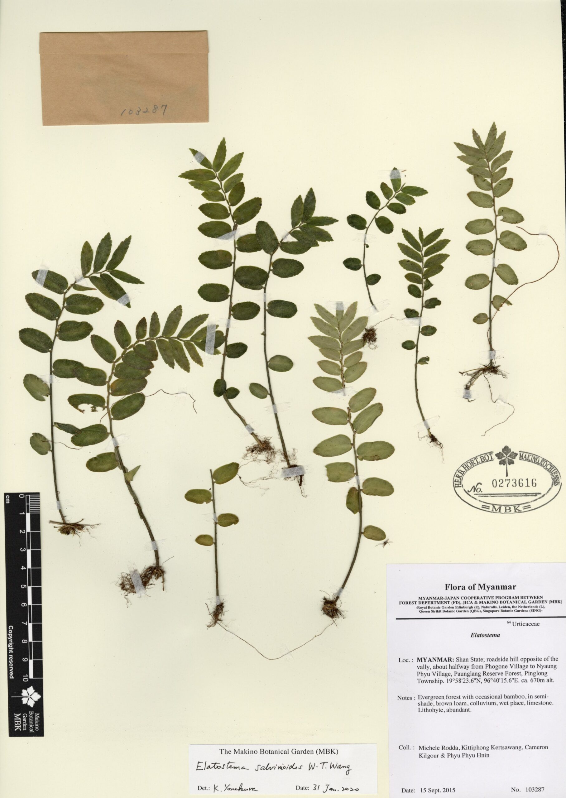 Urticaceae | Elatostema salvinioides W.T. Wang | MYANMAR: Shan State; roadside hill opposite of the vally, about halfway from Phogone Village to Nyaung Phyu Village, Paunglang Reserve Forest, Pinglong Township. | 15 September 2015 | Michele Rodda, Kittiphong Kertsawang, Cameron Kilgour & Phyu Phyu Hnin; | 103287 | 0273616 |