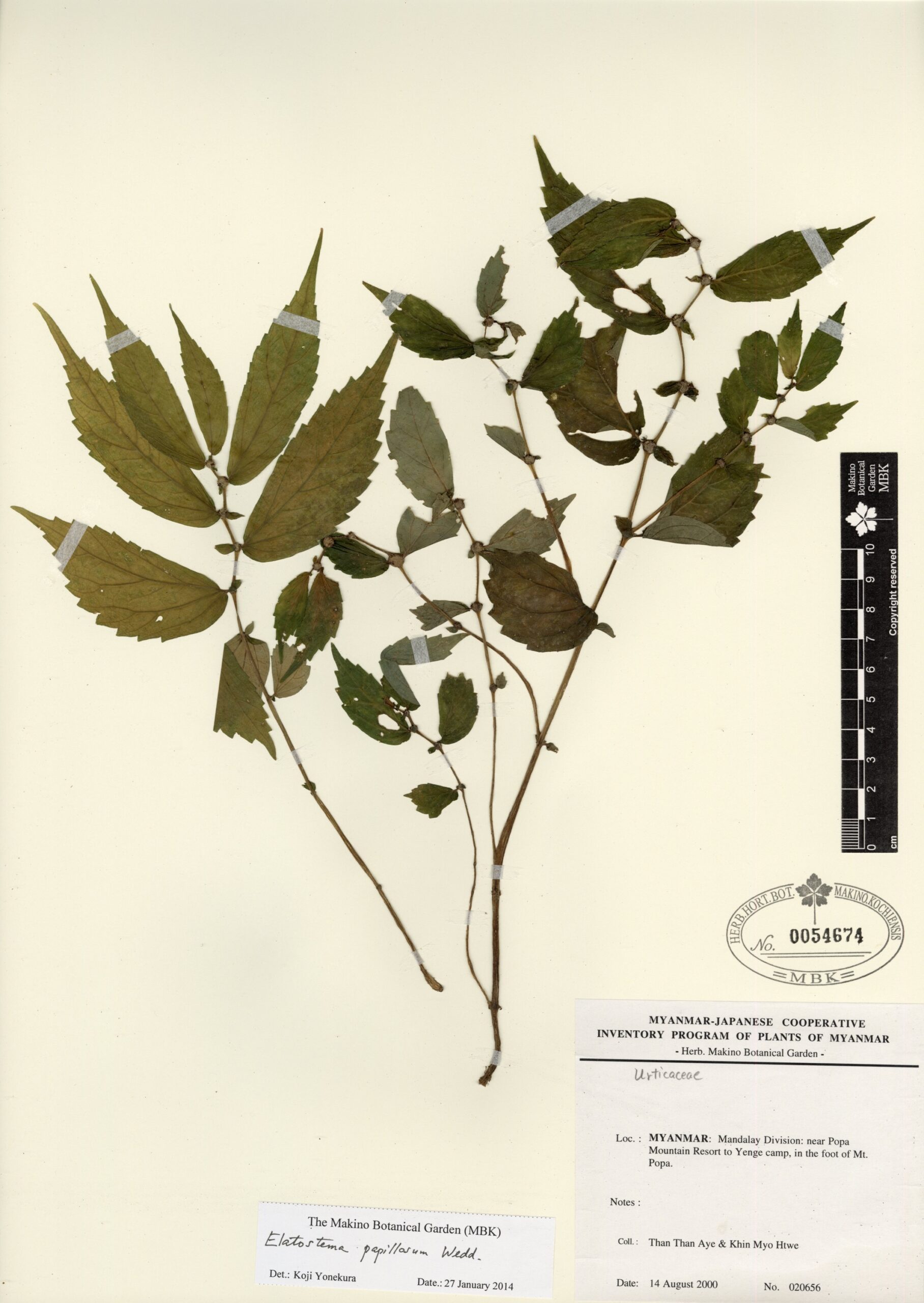 Urticaceae | Elatostema papillosum Wedd. | MYANMAR: Mandalay Division: near Popa Mountain Resort, along the roadside to Ye Nge camp, in the foot of Mt. Popa, Popa Mountain Park , Kyaukpadaung Township,central Myanmar. | 14 August 2000 | Than Than Aye & Khin Myo Htwe; | 020656 | 0054674 |