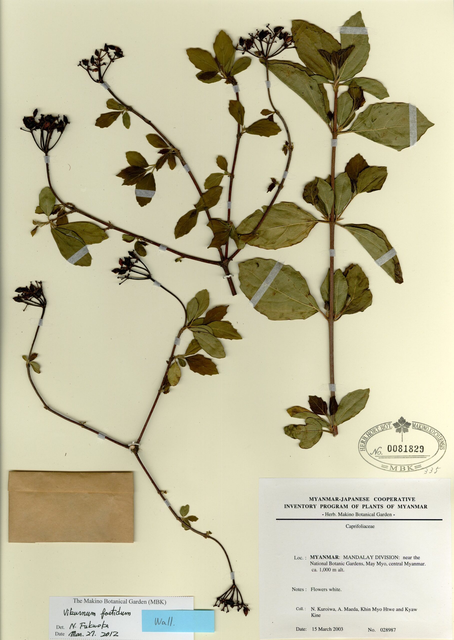 Viburnaceae | Viburnum foetidum Wall. | MYANMAR: MANDALAY DIVISION: near the National Botanic Gardens, May Myo, central Myanmar. | 15 March 2003 | N. Kuroiwa, A. Maeda, Khin Myo Htwe and Kyaw Kine; | 028987 | 0081829 |