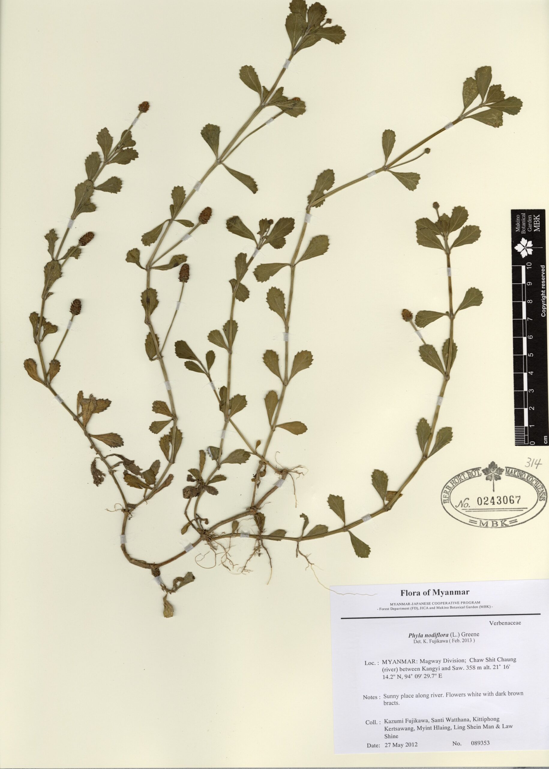 Verbenaceae | Phyla nodiflora (L.) Greene | MYANMAR: Magway Division; Chaw Shit Chaung (river) between Kangyi and Saw. | 27 May 2012 | Kazumi Fujikawa, Santi Watthana, Kittiphong Kertsawang, Myint Hlaing, Ling Shein Man & Law Shine; | 089353 | 0243067 |