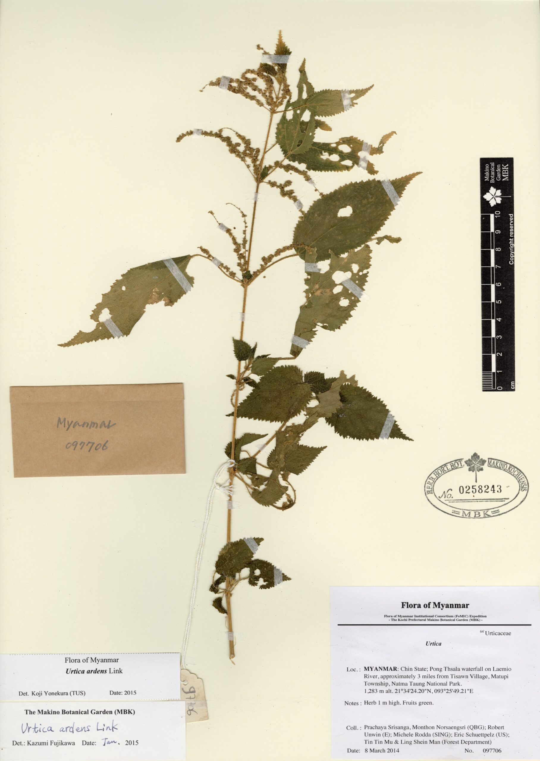 Urticaceae | Urtica ardens Link | MYANMAR: Chin State; Pong Thsala waterfall on Laemio River, approximately 3 miles from Tisawn Village, Matupi Township, Natma Taung National Park. | 8 March 2014 | Prachaya Srisanga, Monthon Norsaengsri (QBG); Robert Unwin (E); Michele Rodda (SING); Eric Schuettpelz (US); Tin Tin Mu & Ling Shein Man (Forest Department); | 097706 | 0258243 |
