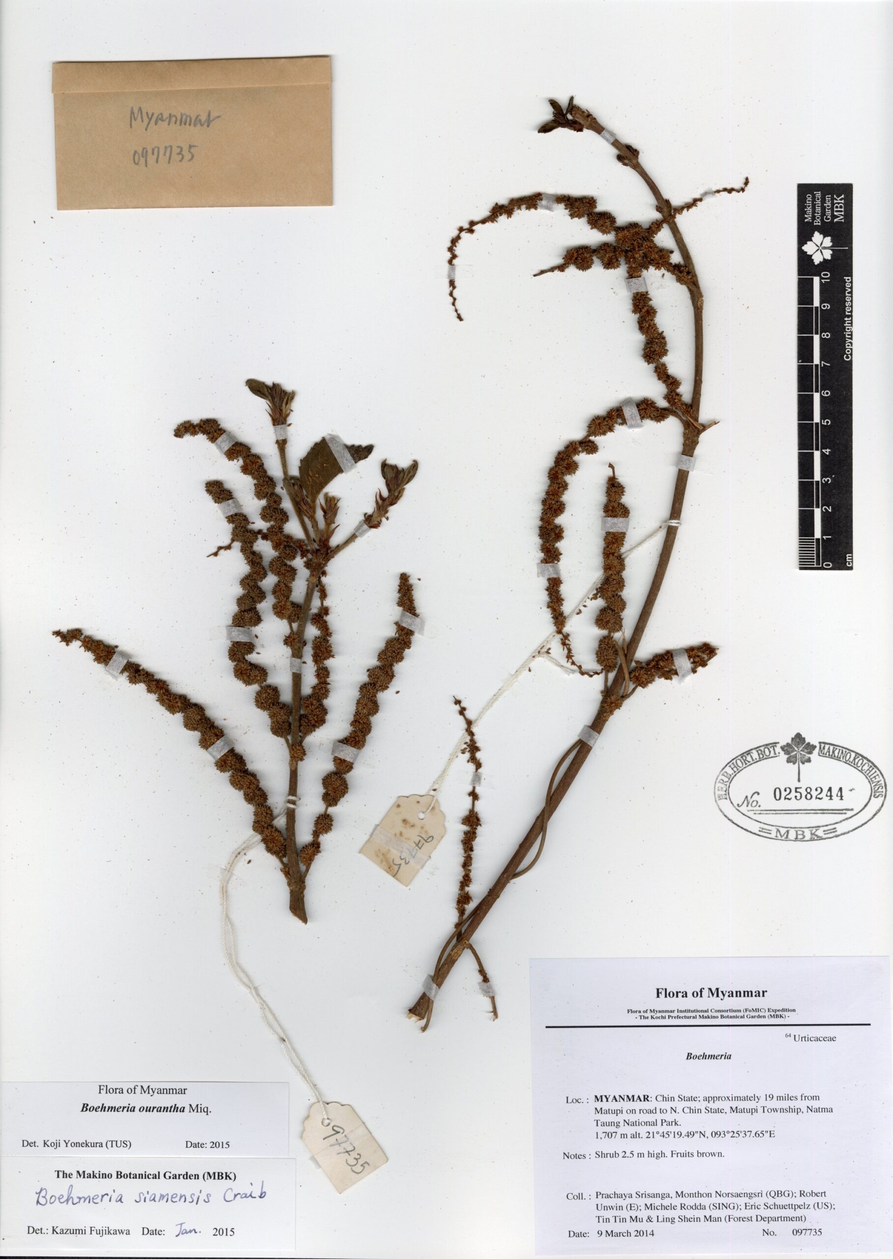 Urticaceae | Boehmeria ourantha Miq. | MYANMAR: Chin State; approximately 19 miles from Matupi on road to N. Chin State, Matupi Township, Natma Taung National Park. | 9 March 2014 | Prachaya Srisanga, Monthon Norsaengsri (QBG); Robert Unwin (E); Michele Rodda (SING); Eric Schuettpelz (US); Tin Tin Mu & Ling Shein Man (Forest Department); | 097735 | 0258244 |