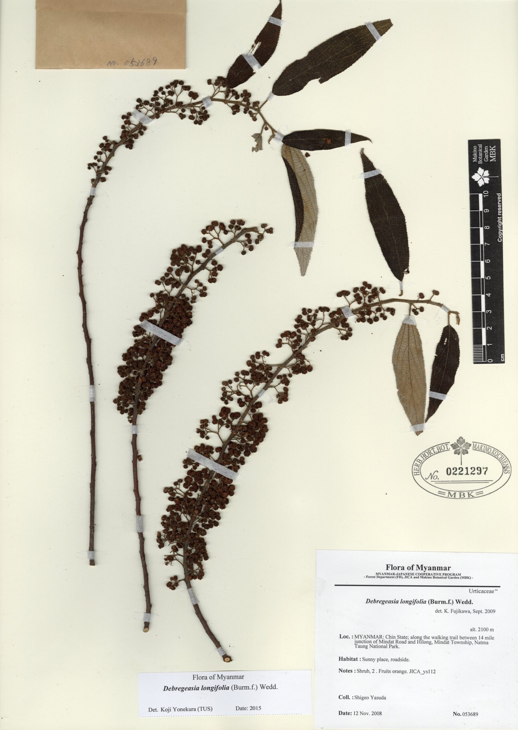 Urticaceae | Debregeasia longifolia (Burm.f.) Wedd. | MYANMAR: CHIN State; along the walking trail between 14 mile junction of Mindat Road and Hilong, Mindat Township, Natma Taung National Park. | 12 November 2008 | Shigeo Yasuda; | 053689 | 0221297 |