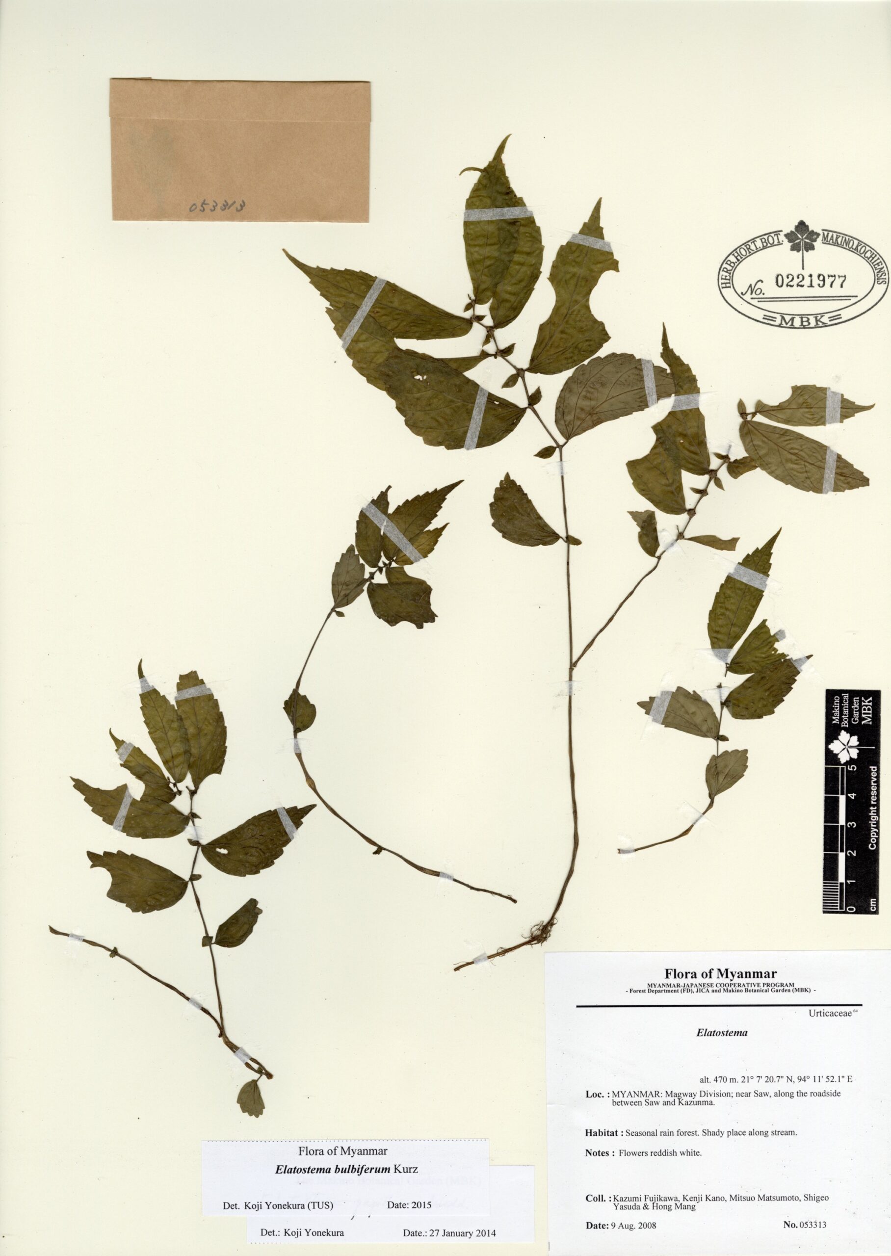 Urticaceae | Elatostema bulbiferum Kurz | MYANMAR: MAGWAY Division; near Saw, along the roadside between Saw and Kazunma. | 9 August 2008 | Kazumi Fujikawa, Kenji Kano, Mitsuo Matsumoto, Shigeo Yasuda & Hong Mang; | 053313 | 0221977 |