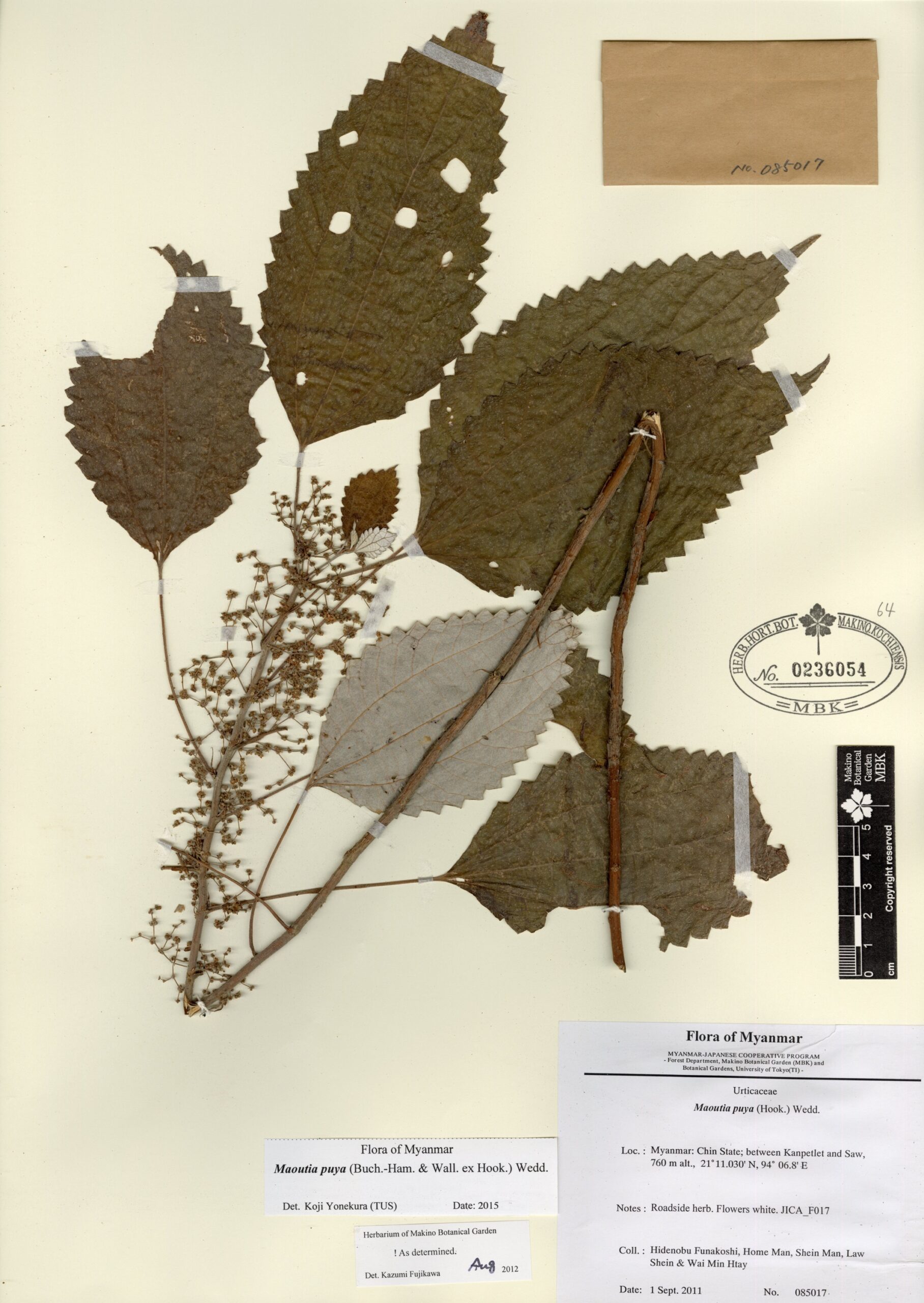 Urticaceae | Maoutia puya (Buch.-Ham. & Wall. ex Hook.) Wedd. | Myanmar: Chin State; between Kanpetlet and Saw. | 1 September 2011 | Hidenobu Funakoshi, Hong Mang, Shein Man, Law Shein & Wai Min Htay; | 085017 | 0236054 |