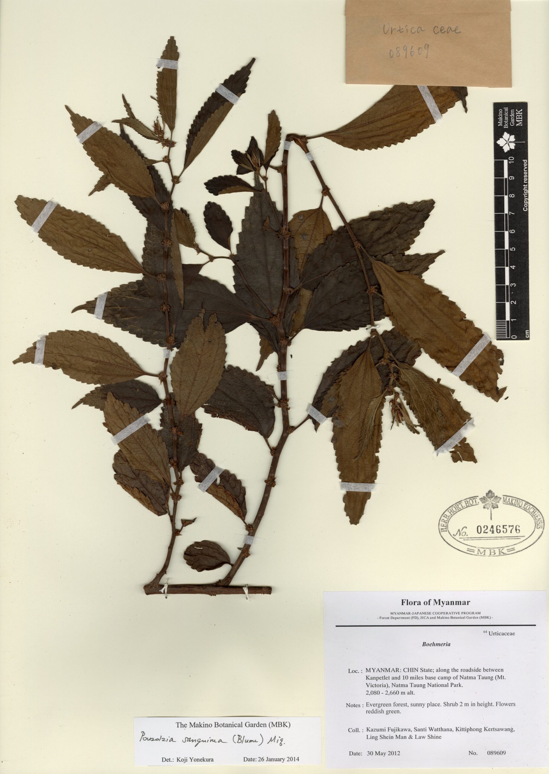Urticaceae | Pouzolzia sanguinea (Blume) Merr. | MYANMAR: CHIN State; along the roadside between Kanpetlet and 10 miles base camp of Natma Taung (Mt. Victoria), Natma Taung National Park. | 30 May 2012 | Kazumi Fujikawa, Santi Watthana, Kittiphong Kertsawang, Ling Shein Man & Law Shine; | 089609 | 0246576 |