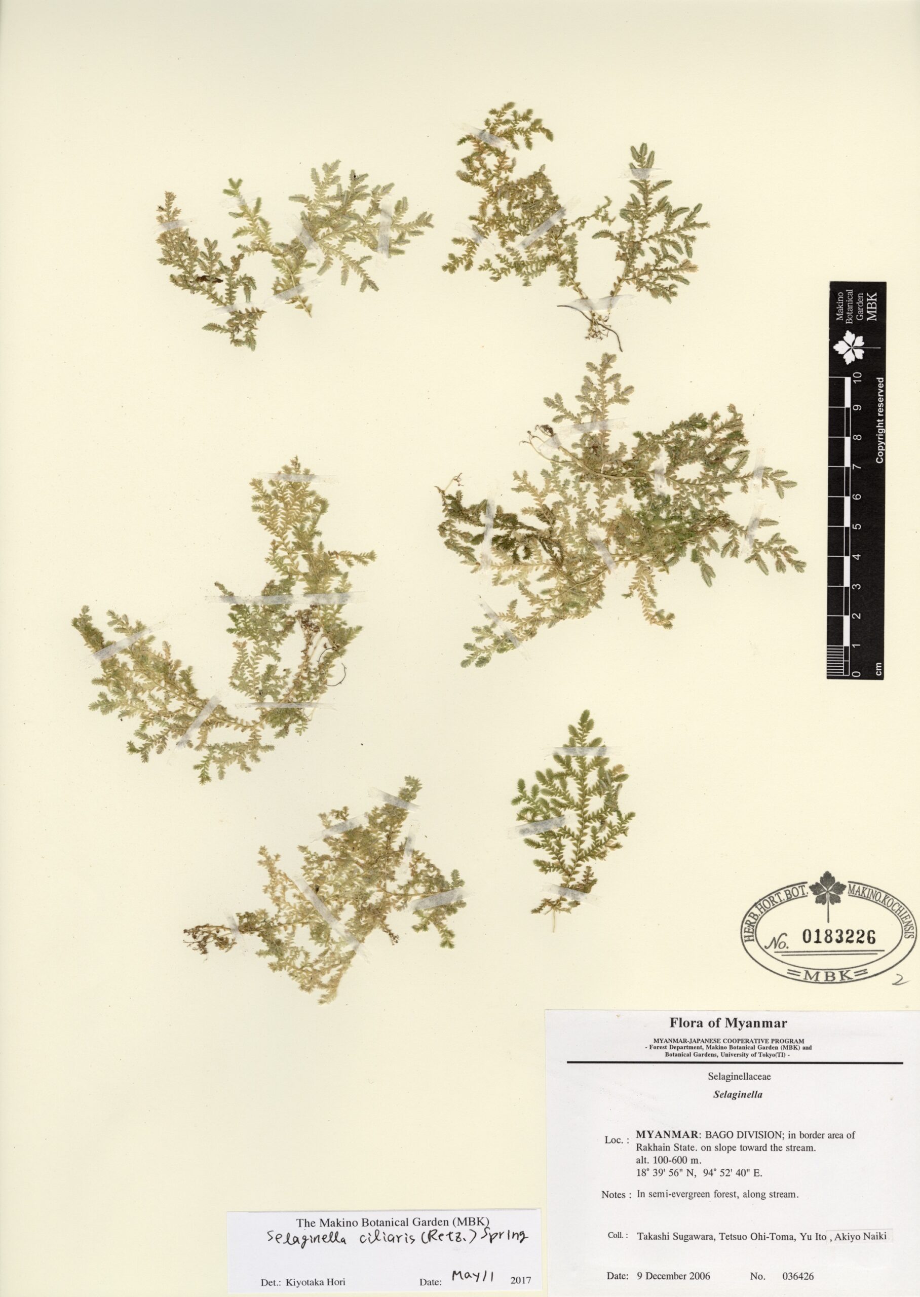 Selaginellaceae | Selaginella ciliaris (Retz.) Spring | MYANMAR: BAGO DIVISION; in border area of Rakhain State. on slope toward the stream. | 9 December 2006 | Takashi Sugawara, Tetsuo Ohi-Toma, Akiyo Naiki & Yu Ito; | 036426 | 0183226 |
