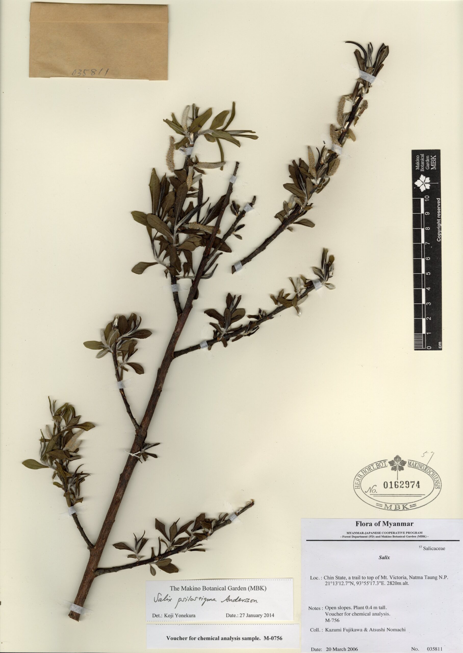 Salicaceae | Salix psilostigma Andersson | Chin State, a trail to top of Mt. Victoria, Natma Taung N.P. | 20 March 2006 | Kazumi Fujikawa & Atsushi Nomachi; | 035811 | 0162974 |