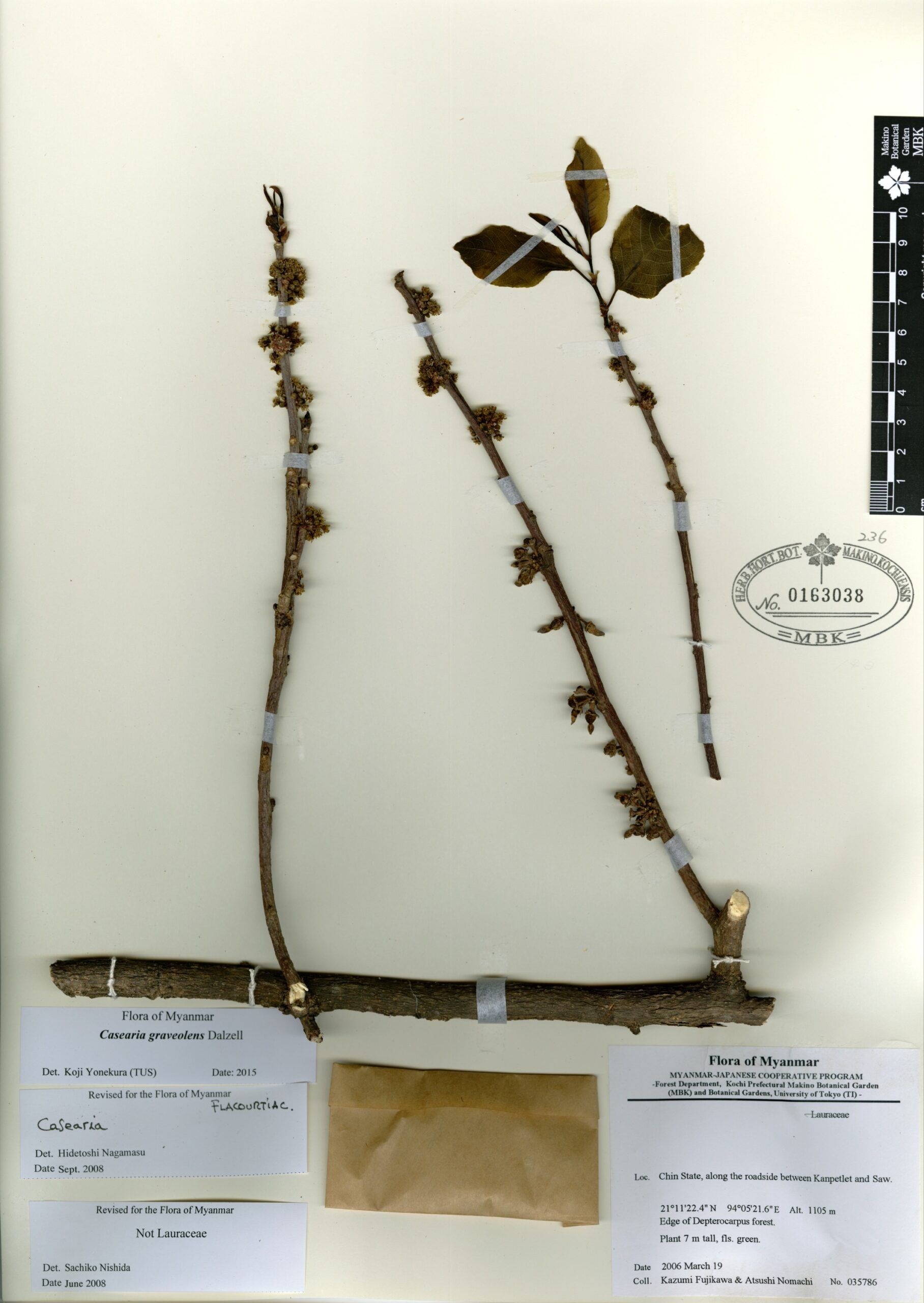 Salicaceae | Casearia graveolens Dalzell | MYANMAR: Chin State, along the roadside between Kanpetlet and Saw. | 19 March 2006 | Kazumi Fujikawa & Atsushi Nomachi; | 035786 | 0163038 |