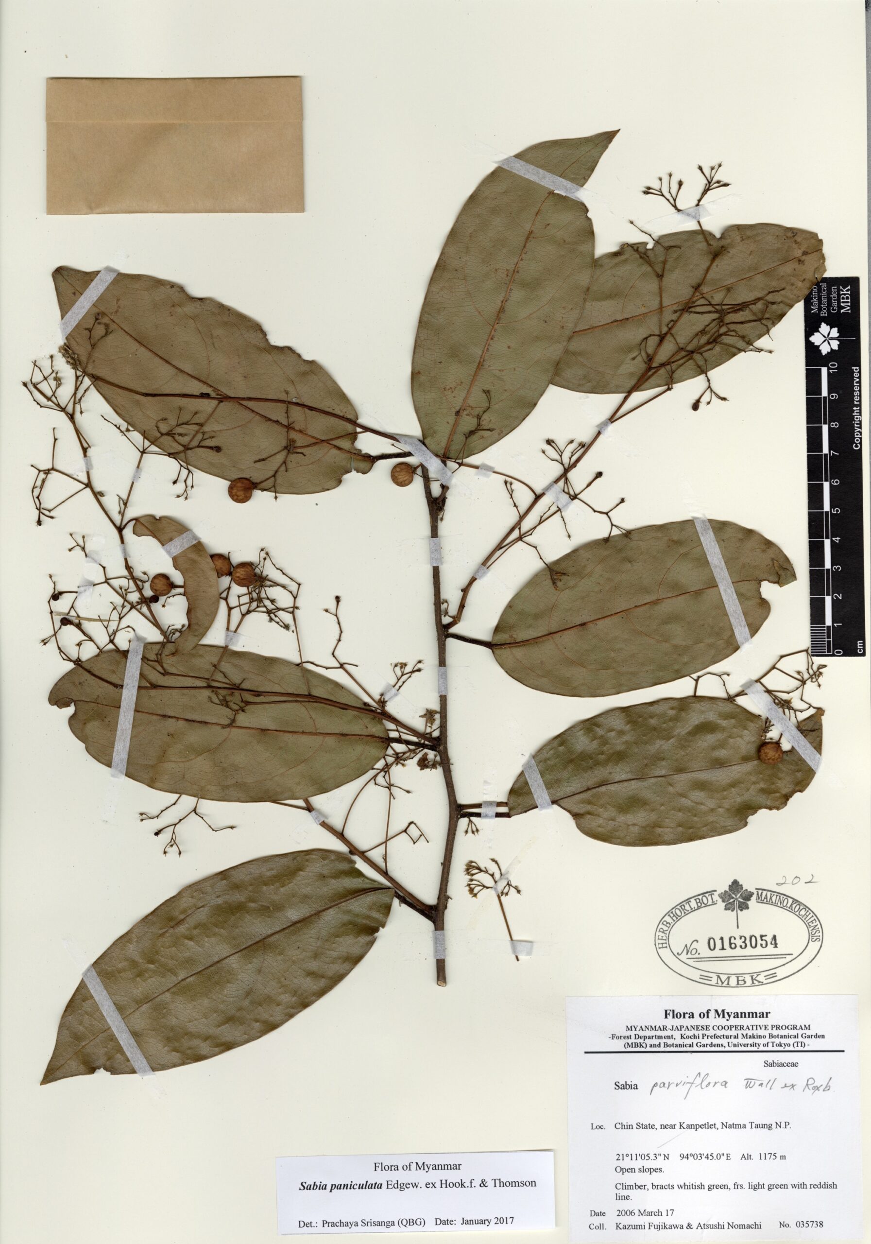 Sabiaceae | Sabia paniculata Edgew. ex Hook.f. & Thomson | Chin State, near Kanpetlet, Natma Taung N.P. | 17 March 2006 | Kazumi Fujikawa & Atsushi Nomachi; | 035738 | 0163054 |