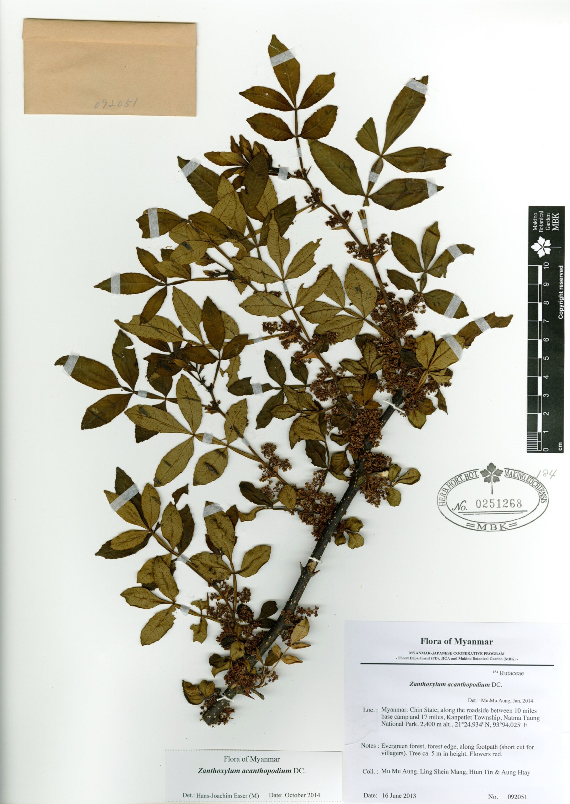 Rutaceae | Zanthoxylum armatum DC. | MYANMAR: CHIN State; along the roadside between Kanpetlet and 10 miles base camp of Natma Taung (Mt. Victoria), Natma Taung National Park. | 30 May 2012 | Kazumi Fujikawa, Santi Watthana, Kittiphong Kertsawang, Ling Shein Man & Law Shine; | 089560 | 0246496 |