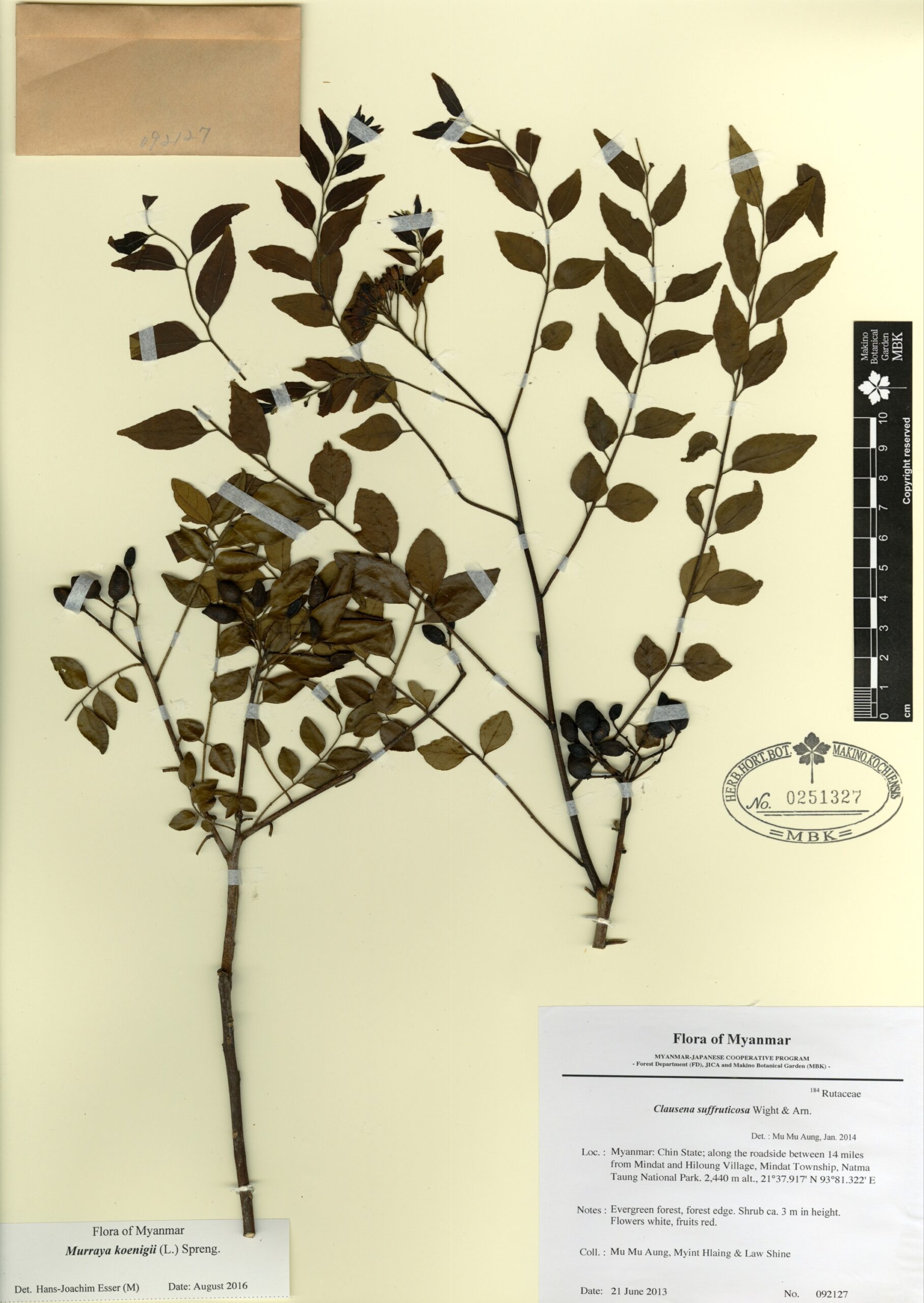 Rutaceae | Murraya koenigii (L.) Spreng. | Myanmar: Chin State; along the roadside between 14 miles from Mindat and Hiloung Village, Mindat Township, Natma Taung National Park. | 21 June 2013 | Mu Mu Aung, Myint Hlaing & Law Shine; | 092127 | 0251327 |