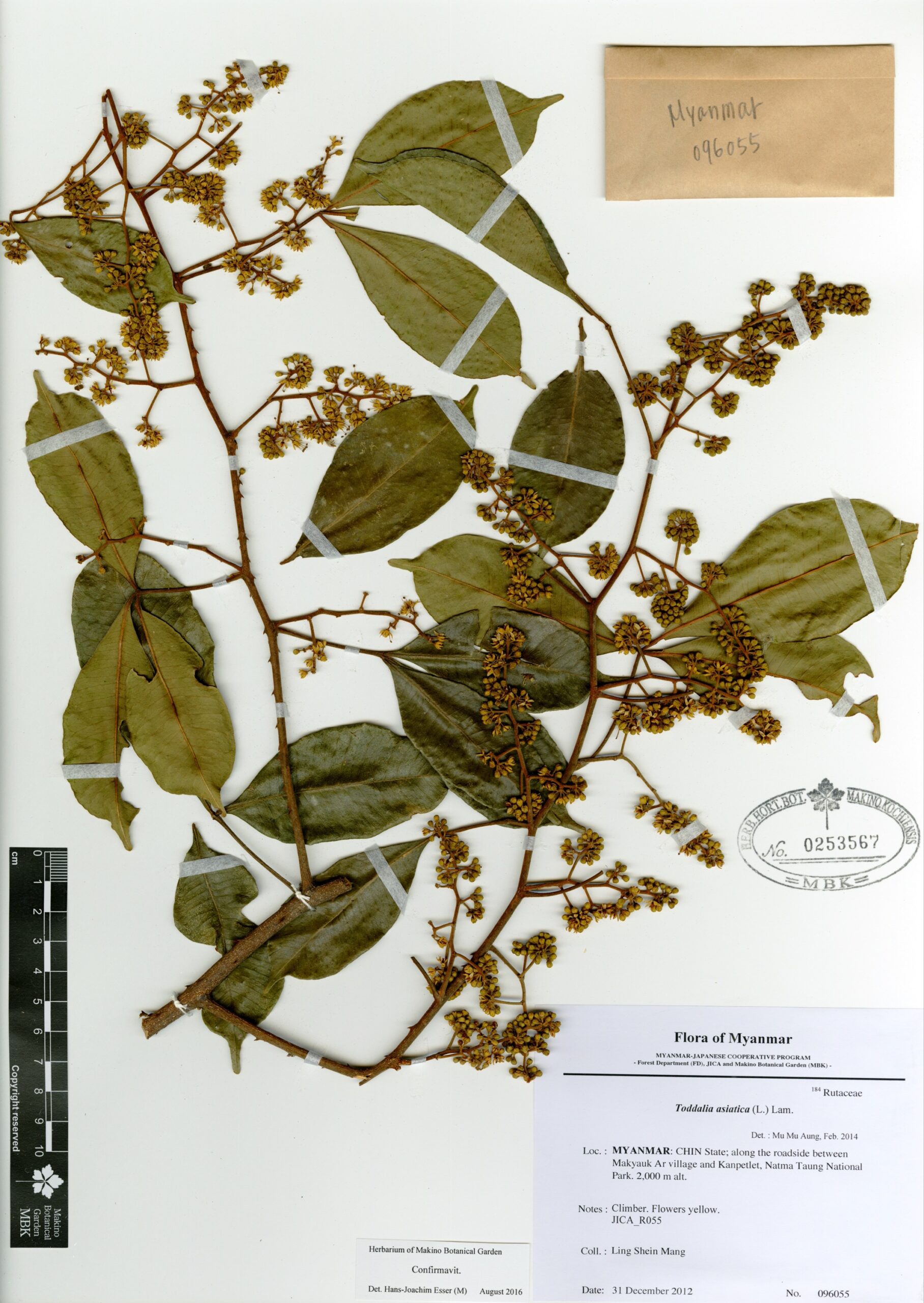 Rutaceae | Toddalia asiatica (L.) Lam. | MYANMAR: CHIN State; along the roadside between Makyauk Ar village and Kanpetlet, Natma Taung National Park. | 31 December 2012 | Ling Shein Mang; | 096055 | 0253567 |