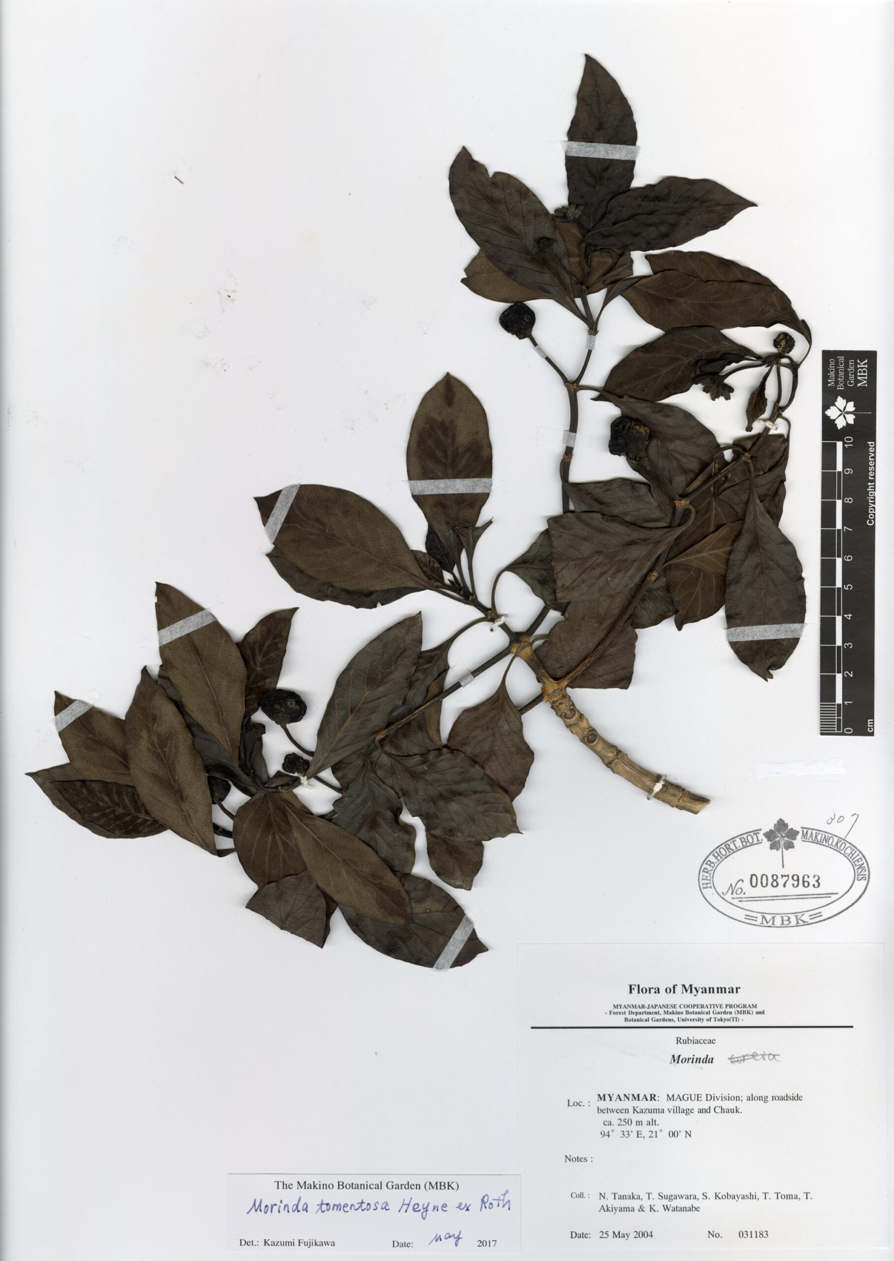 Rubiaceae | Morinda tomentosa Heyne ex Roth | MYANMAR: MAGWAY DIVISION: along roadside between Kazuma village and Chauk. | 25 May 2004 | N. Tanaka, T. Sugawara, S. Kobayashi, T. Toma, T. Akiyama & K. Watanabe; | 031183 | 0087963 |