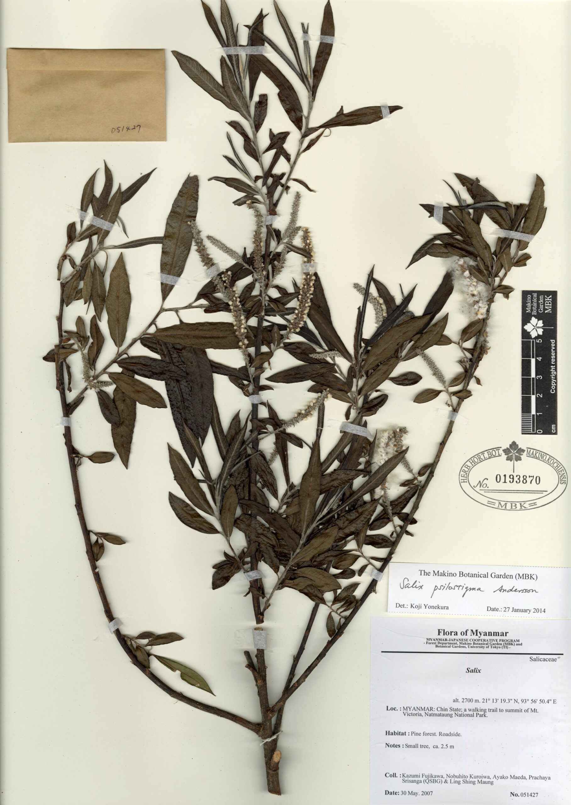 Salicaceae | Salix psilostigma Andersson | Chin State, a trail to top of Mt. Victoria, Natma Taung N.P. | 20 March 2006 | Kazumi Fujikawa & Atsushi Nomachi; | 035811 | 0162974 |