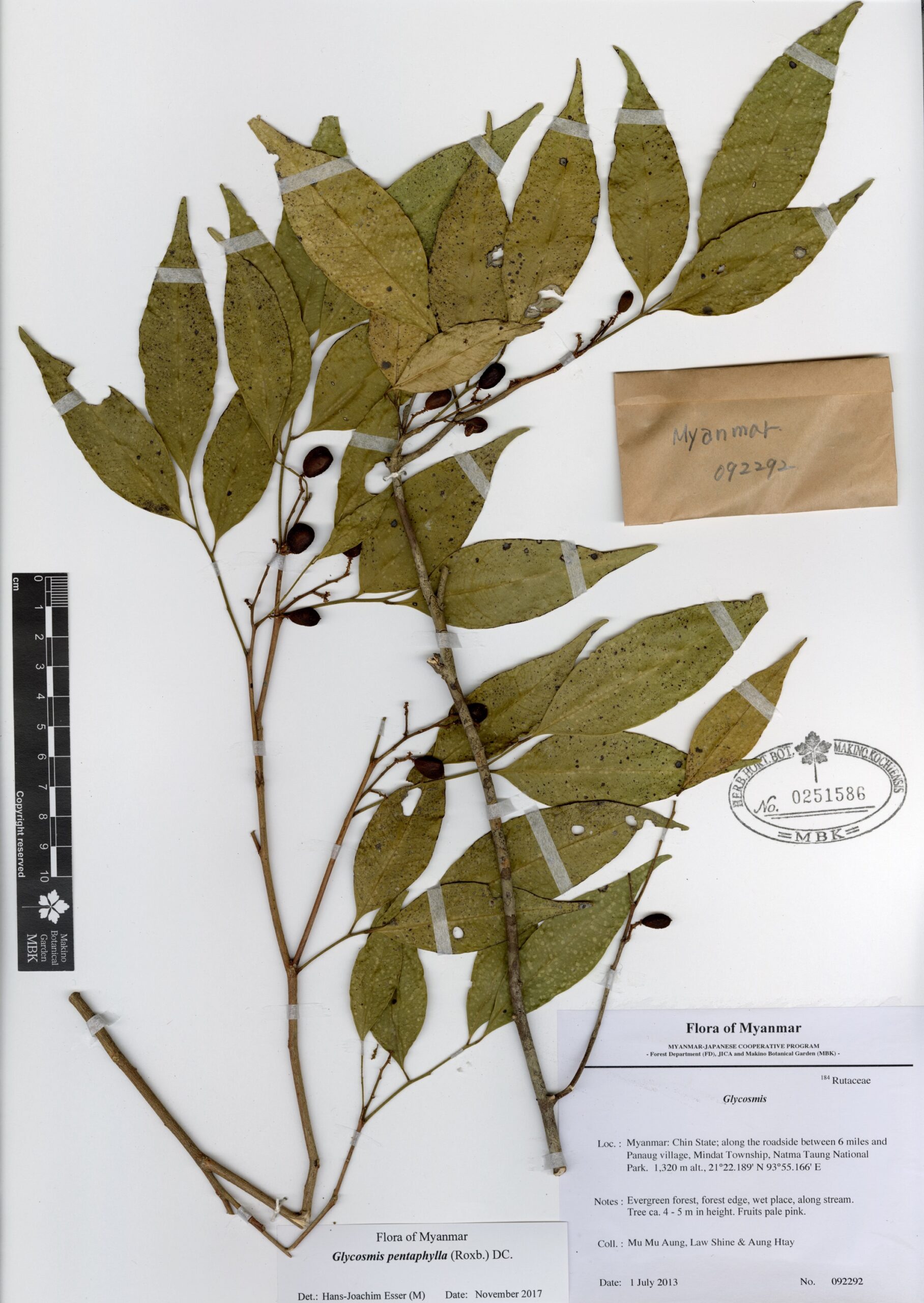 Rutaceae | Glycosmis pentaphylla (Roxb.) DC. | Myanmar: Chin State; along the roadside between 6 miles and Panaug village, Mindat Township, Natma Taung National Park. | 1 July 2013 | Mu Mu Aung, Law Shine & Aung Htay; | 092292 | 0251586 |
