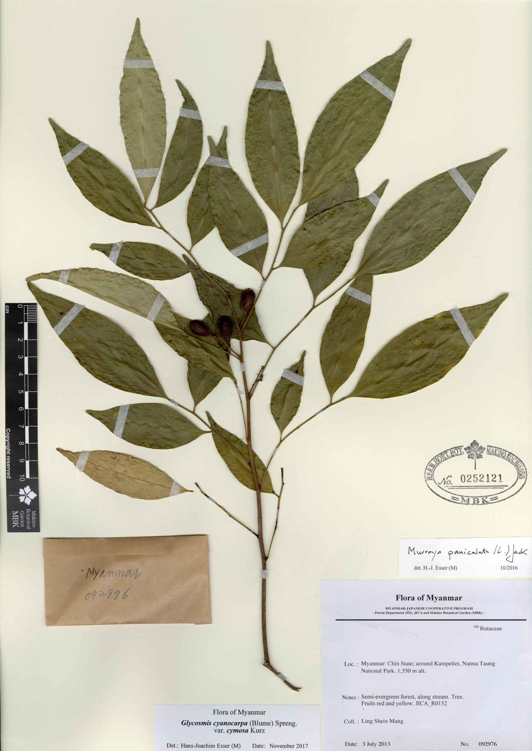 Rutaceae | Glycosmis cyanocarpa (Blume) Spreng. var. cymosa Kurz | MYANMAR: Chin State; around Kampetlet, Natma Taung National Park. | 3 July 2013 | Ling Shein Mang; | 092976 | 0252121 |
