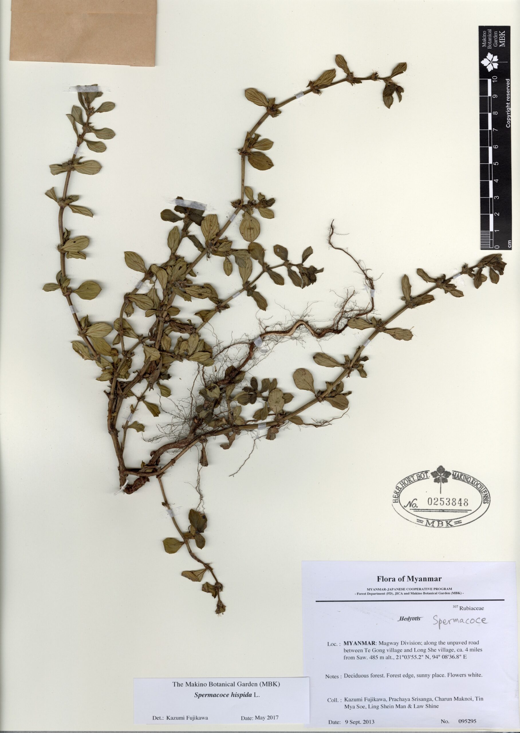Rubiaceae | Spermacoce hispida L. | MYANMAR: Magway Division; along the unpaved road between Te Gong village and Long She village, ca. 4 miles from Saw. | 9 September 2013 | Kazumi Fujikawa, Prachaya Srisanga, Charun Maknoi, Tin Mya Soe, Ling Shein Man & Law Shine; | 095295 | 0253848 |