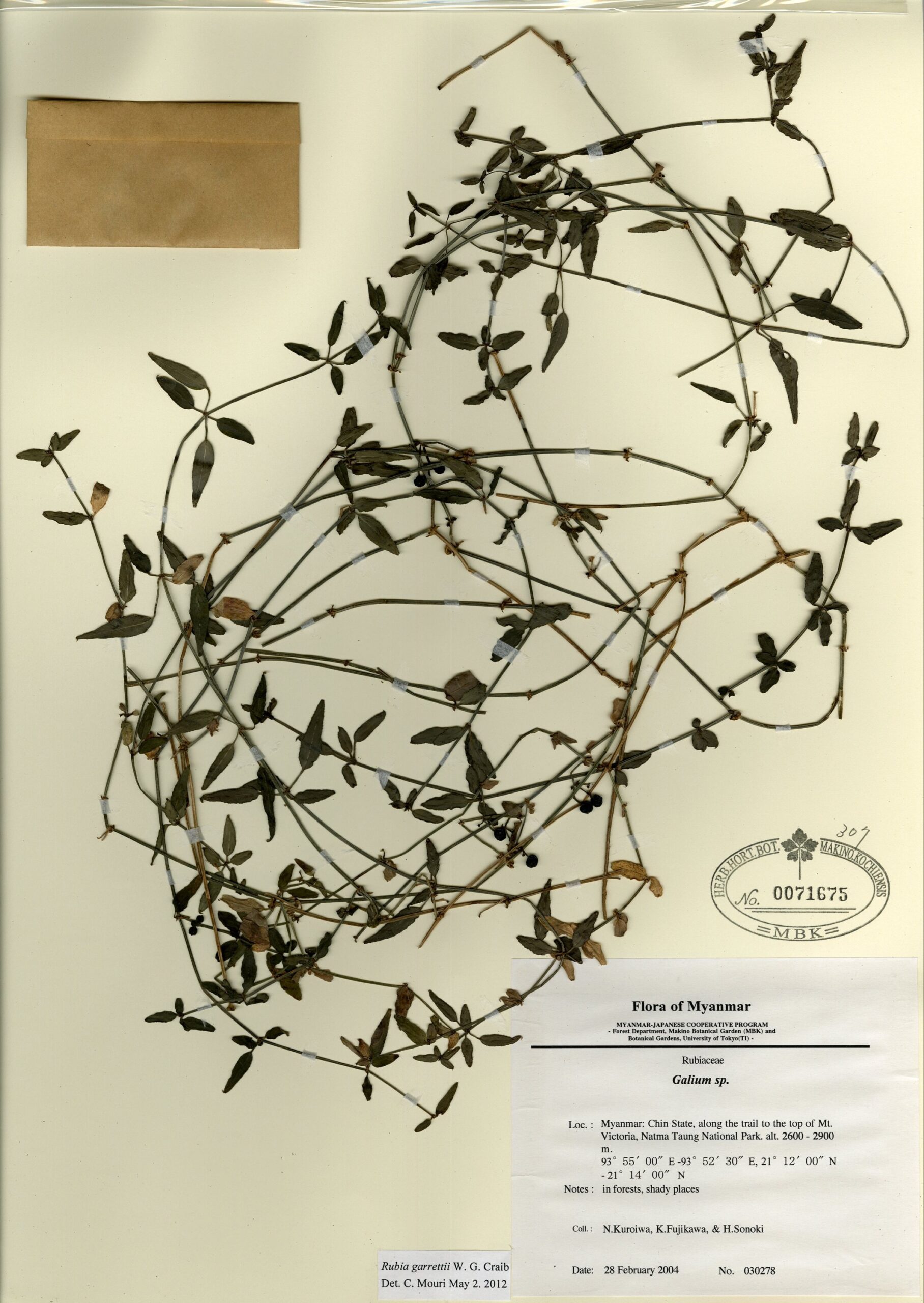 Rubiaceae | Rubia garrettii Craib | MYANMAR: Chin State, along the trail to the top of Mt. Victoria, Natma Taung National Park. | 28 February 2004 | N. Kuroiwa, K. Fujikawa & H. Sonoki; | 030278 | 0071675 |