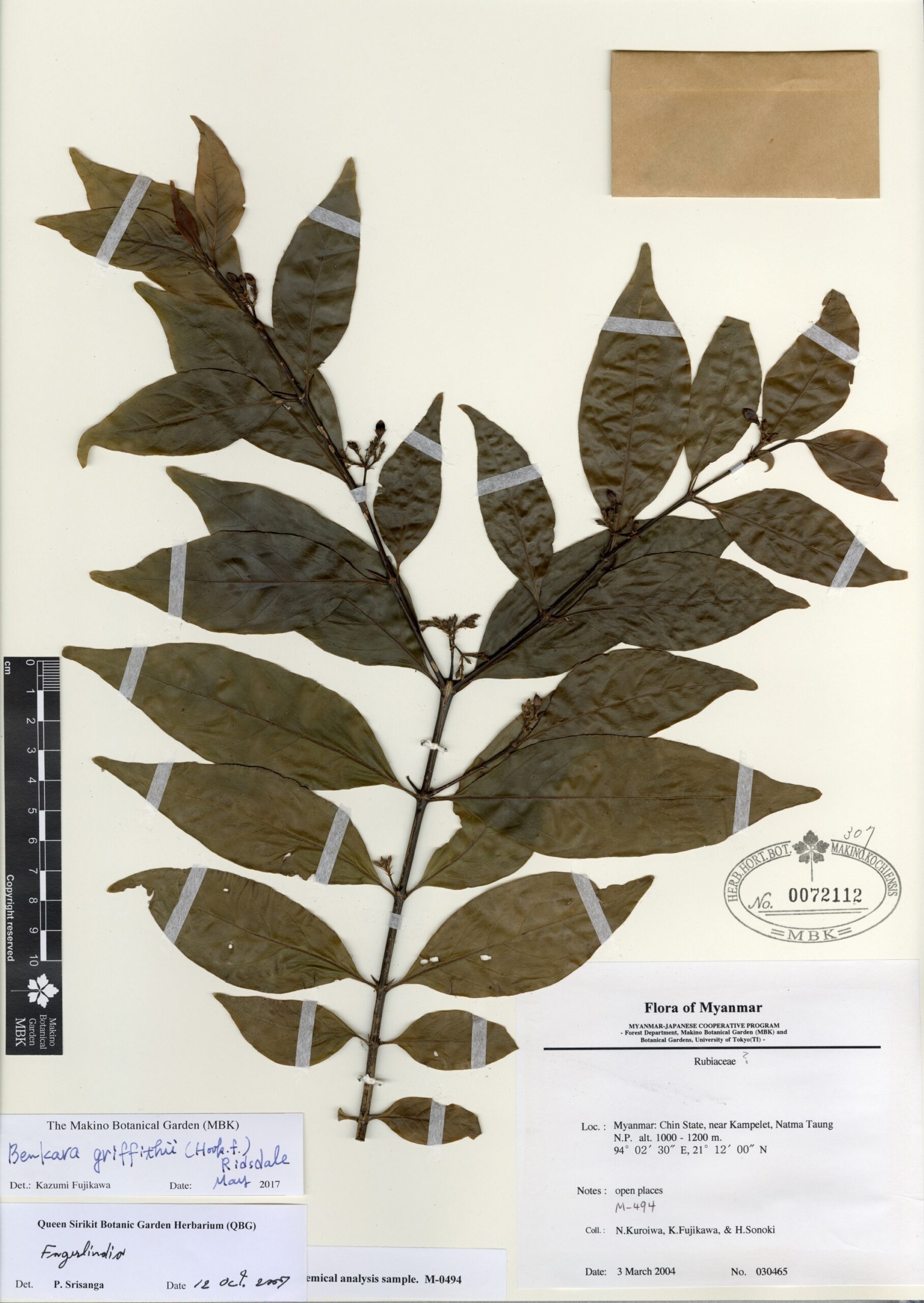 Rubiaceae | Benkara griffithii (Hook.f.) Ridsdale | MYANMAR: Chin State, near Kampelet, Natma Taung N.P. | 3 March 2004 | N. Kuroiwa, K. Fujikawa & H. Sonoki; | 030465 | 0072112 |
