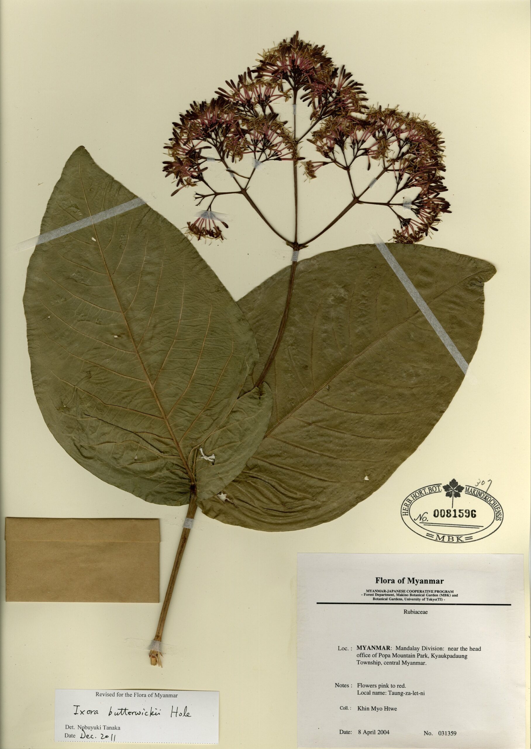 Rubiaceae | Ixora butterwickii Hole | MYANMAR: Mandalay Division: near the head office of Popa Mountain Park, Kyaukpadaung Township, central Myanmar. | 8 April 2004 | Khin Myo Htwe; | 031359 | 0081596 |