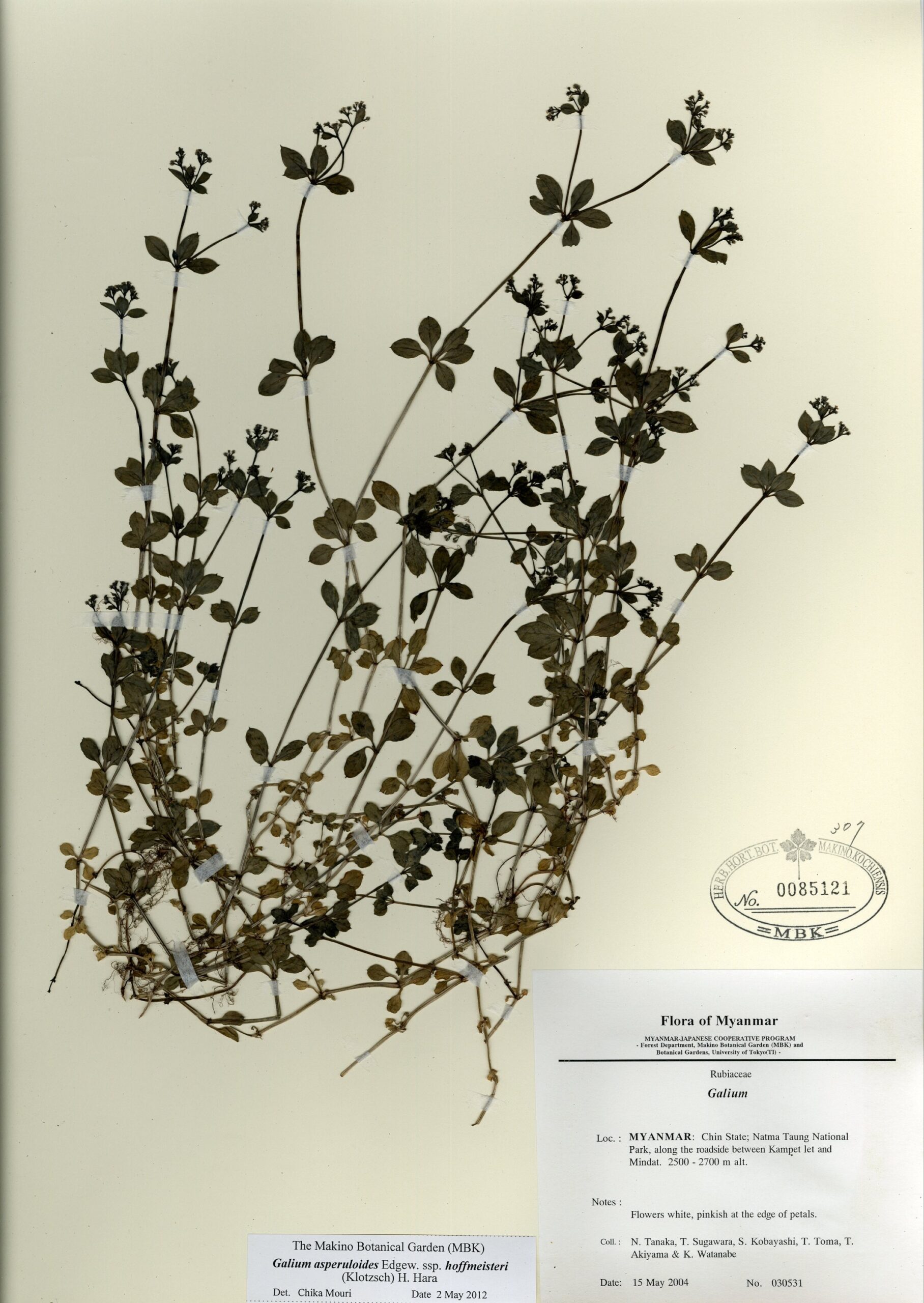 Rubiaceae | Rubia wallichiana Decne. s.l. | MYANMAR: Chin State; Natma Taung National Park, along the roadside between 56 miles point and Mt. Mow Bi. | 17 May 2004 | N. Tanaka, T. Sugawara, S. Kobayashi, T. Toma, T. Akiyama & K. Watanabe; | 030624 | 0085839 |