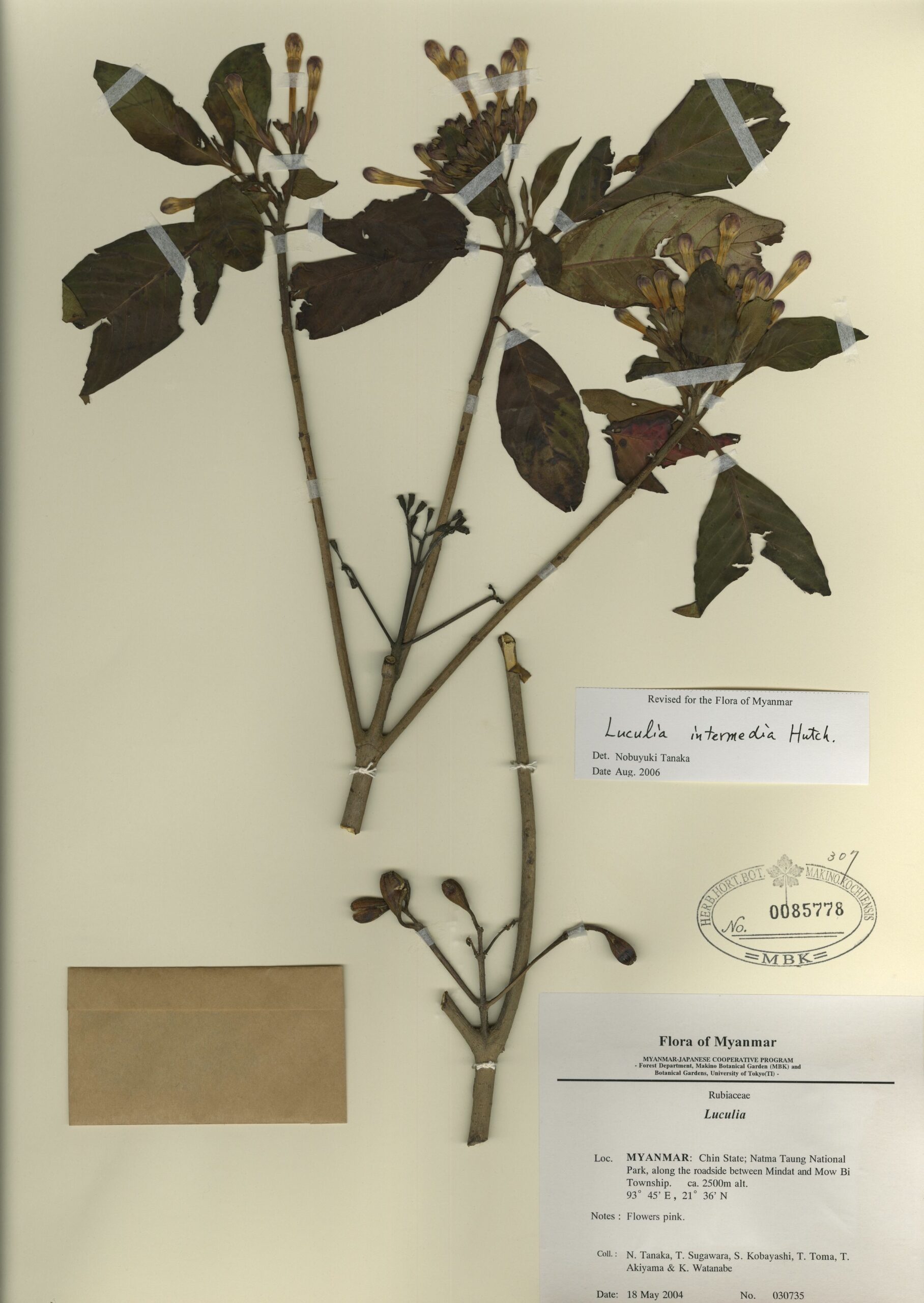 Rubiaceae | Luculia pinceana Hook. | MYANMAR: Chin State; Natma Taung National Park, along the roadside between Mindat and Mow Bi Township. | 18 May 2004 | N. Tanaka, T. Sugawara, S. Kobayashi, T. Toma, T. Akiyama & K. Watanabe; | 030735 | 0085778 |