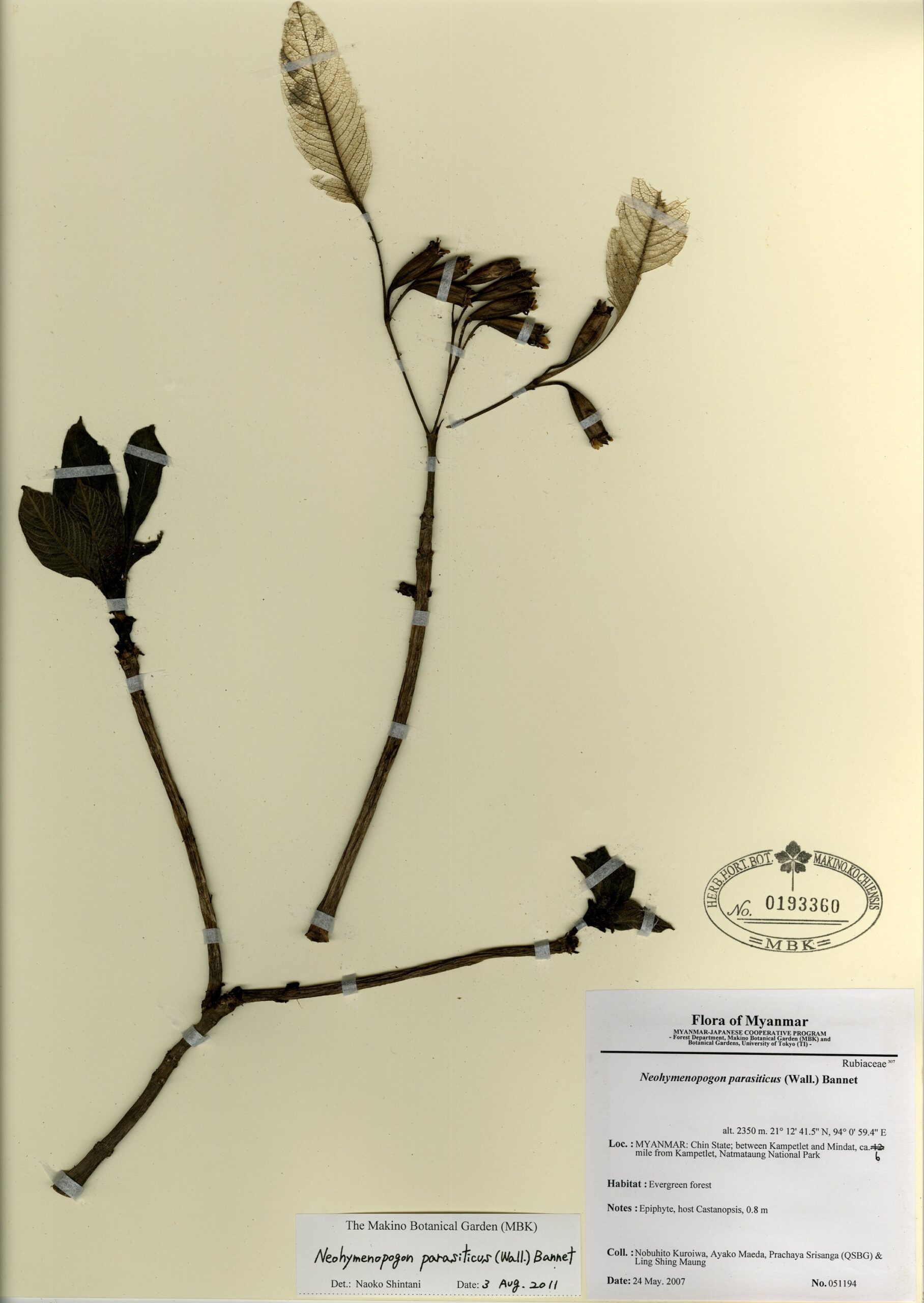 Rubiaceae | Neohymenopogon parasiticus (Wall.) Bennet | MYANMAR: Chin State; road between Kampetlet and Mindat, ca. 6 miles from Kampetlet, Natmataung National Park. | 24 May 2007 | Nobuhito Kuroiwa, Ayako Maeda, Prachaya Srisanga (QSBG) & Ling Shing Maung; | 051194 | 0193360 |