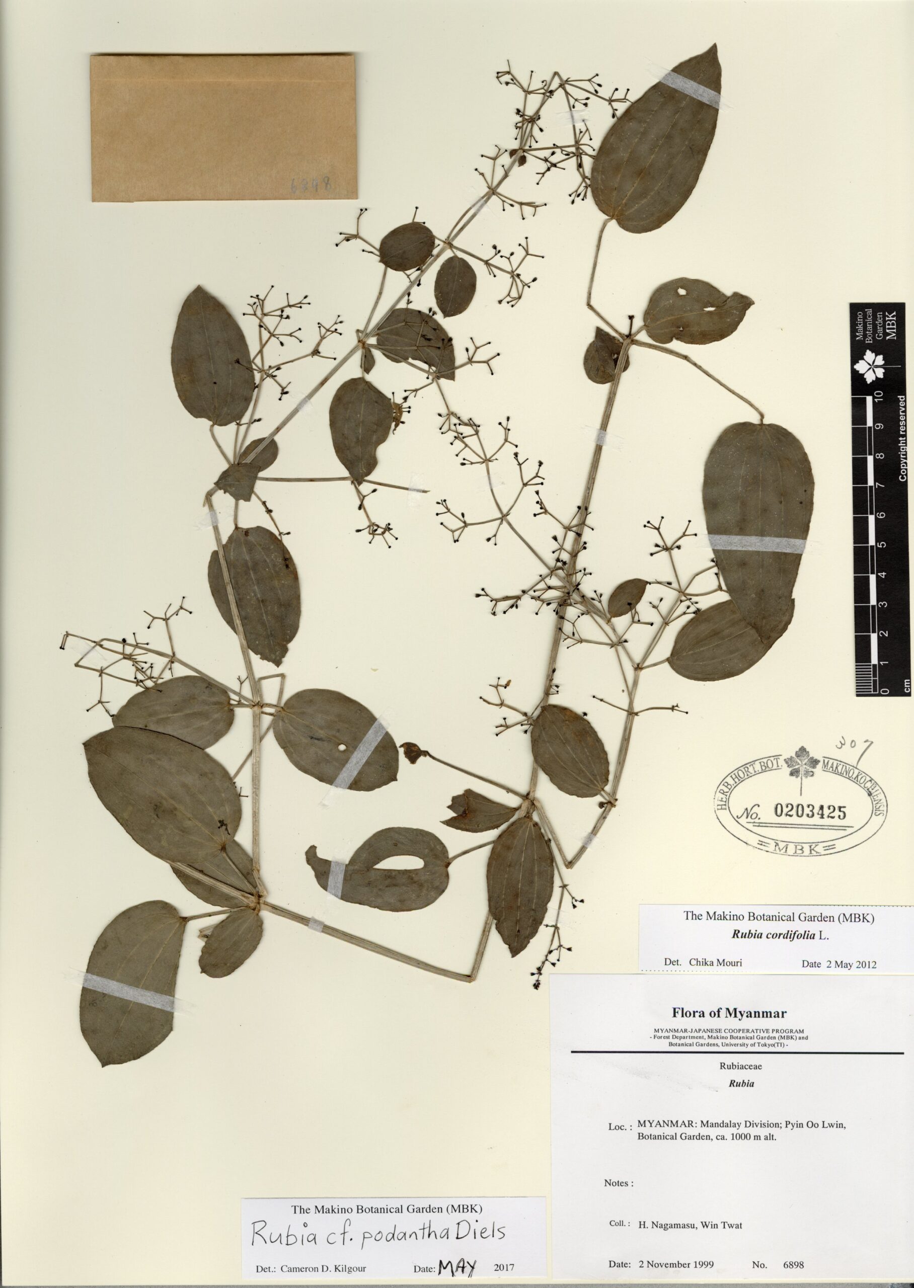 Rubiaceae | Rubia cf. podantha Diels | MYANMAR: Mandalay Division; Pyin Oo Lwin, Botanical Garden. | 2 November 1999 | H. Nagamasu, Win Twat; | 6898 | 0203425 |