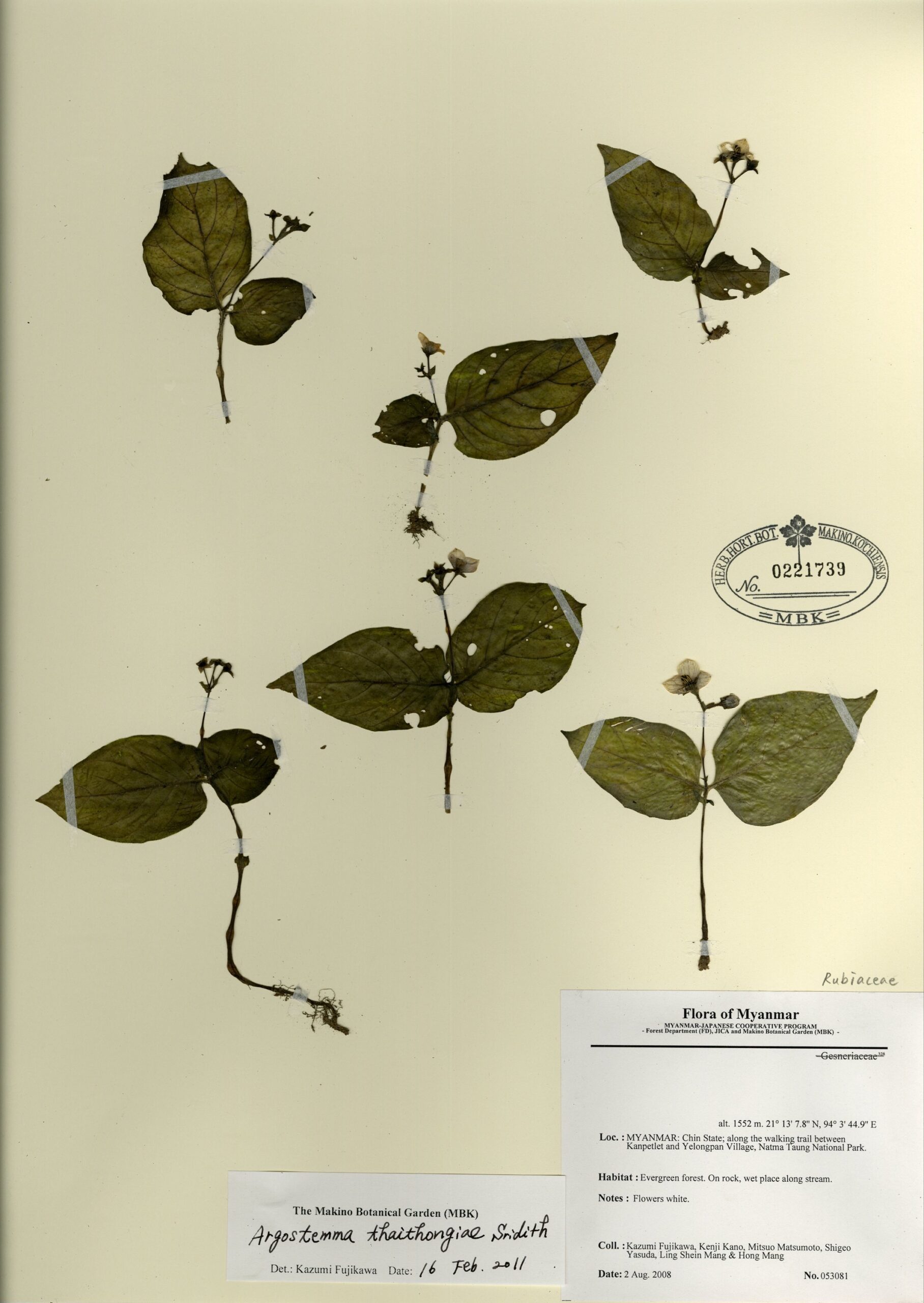 Rubiaceae | Argostemma sarmentosum Wall. | MYANMAR: CHIN State; along the walking trail between Kanpetlet and Yelongpan Village, Natma Taung National Park. | 2 August 2008 | Kazumi Fujikawa, Kenji Kano, Mitsuo Matsumoto, Shigeo Yasuda, Ling Shein Man & Hong Mang; | 053081 | 0221739 |