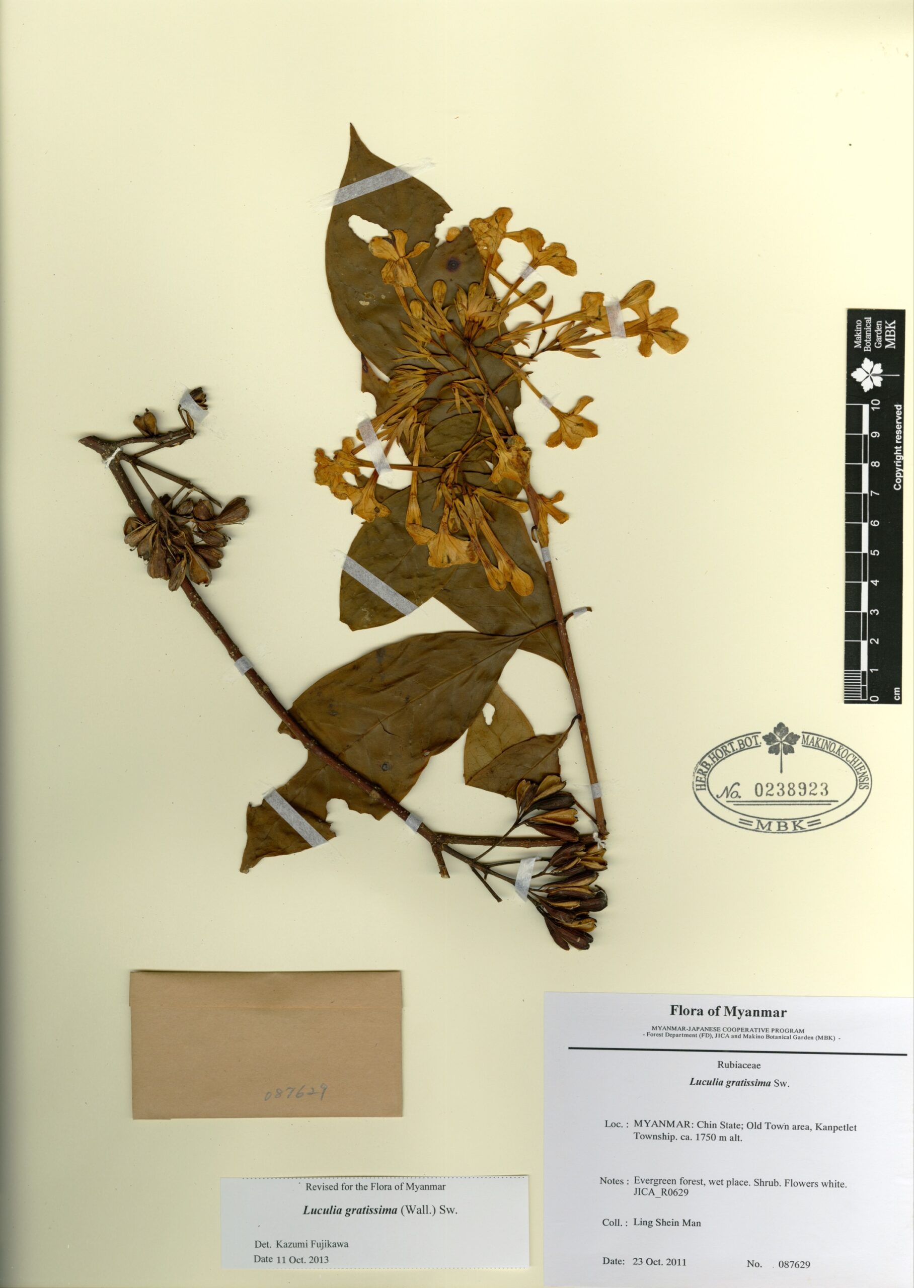 Rubiaceae | Luculia gratissima (Wall.) Sw. | MYANMAR: Chin State; Old Town area, Kanpetlet Township. | 23 October 2011 | Ling Shein Man; | 087629 | 0238923 |