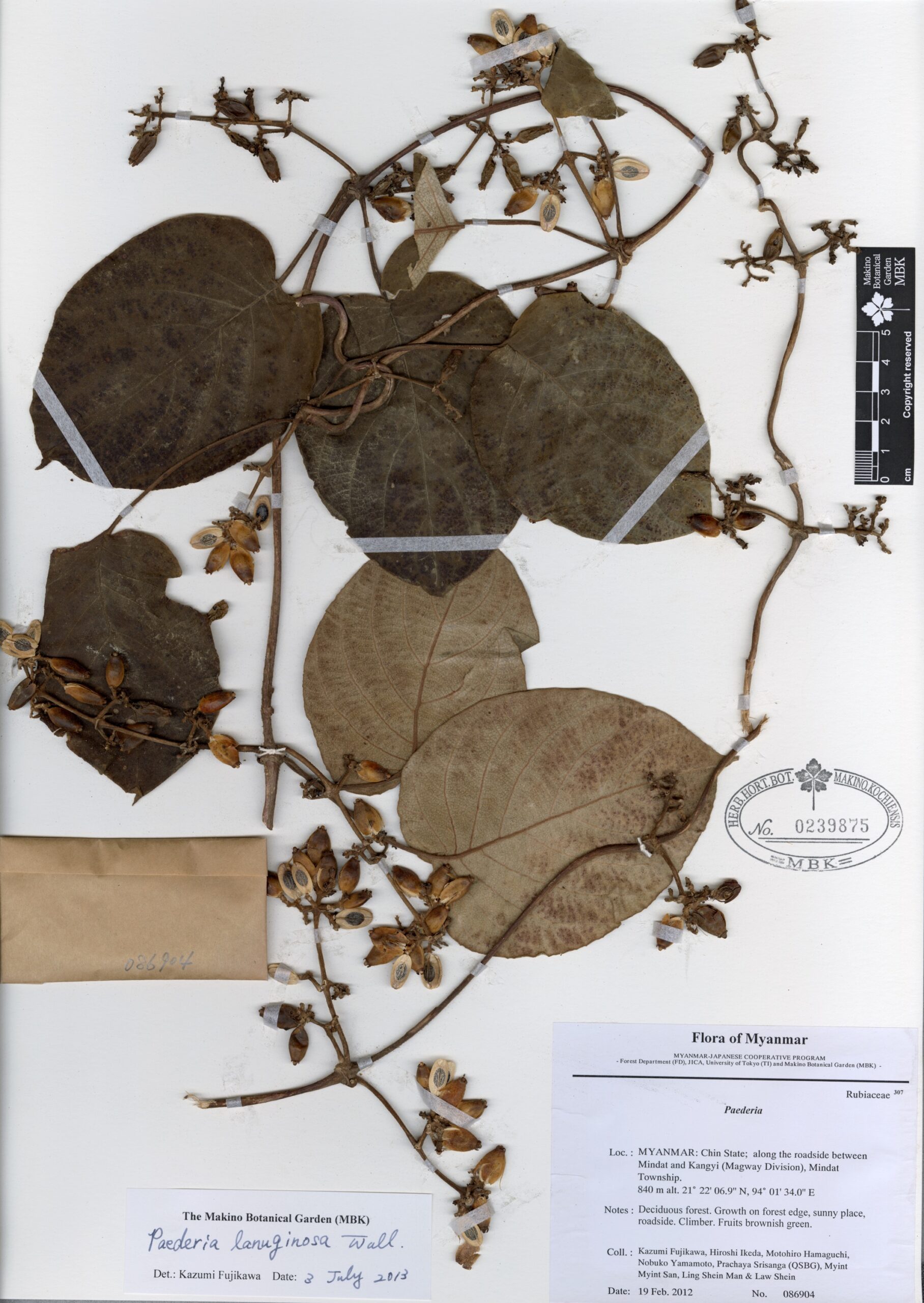 Rubiaceae | Paederia lanuginosa Wall. | MYANMAR: Chin State; along the roadside between Mindat and Kangyi (Magway Division), Mindat Township. | 19 February 2012 | Kazumi Fujikawa, Hiroshi Ikeda, Motohiro Hamaguchi, Nobuko Yamamoto, Prachaya Srisanga (QSBG), Myint Myint San, Ling Shein Man & Law Shein; | 086904 | 0239875 |