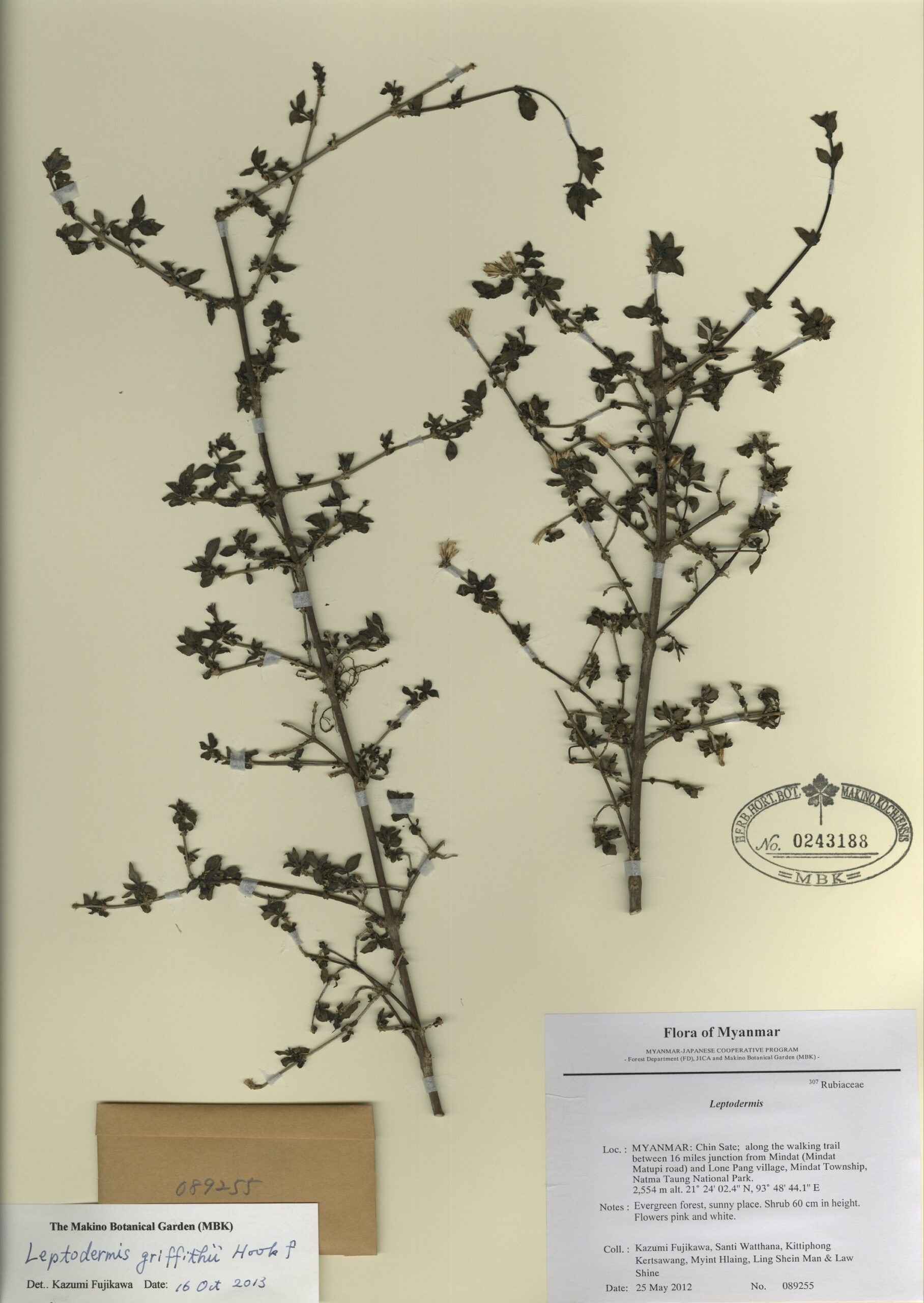 Rubiaceae | Leptodermis griffithii Hook. f. | MYANMAR: Chin State; along the walking trail between 16 miles junction from Mindat (Mindat-Matupi road) and Lone Pang village, Mindat Township, Natma Taung National Park. | 25 May 2012 | Kazumi Fujikawa, Santi Watthana, Kittiphong Kertsawang, Myint Hlaing, Ling Shein Man & Law Shine; | 089255 | 0243188 |