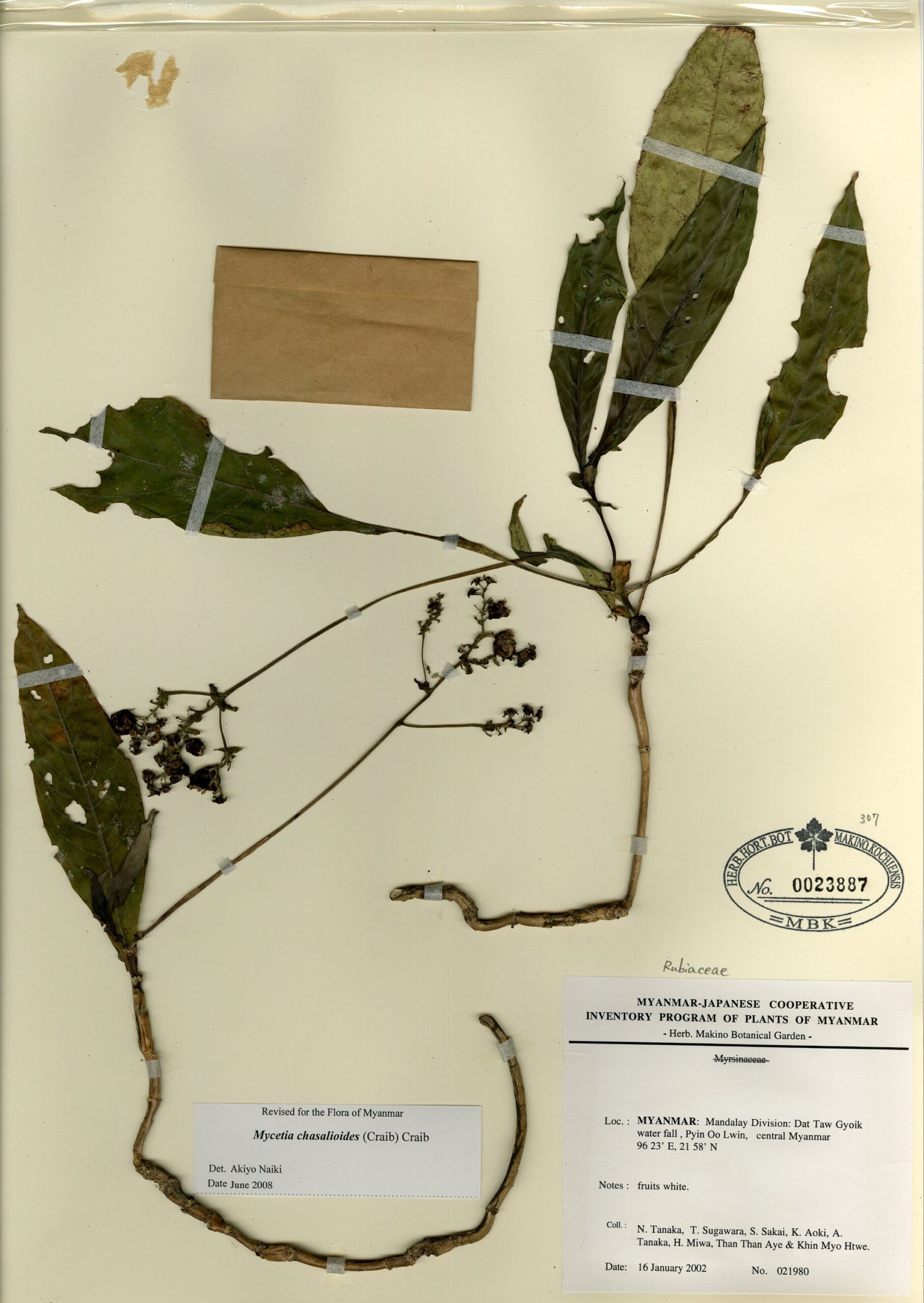 Rubiaceae | Mycetia chasalioides (Craib) Craib | MYANMAR: Mandalay Division: Dat Taw Gyoik water fall, Pyin Oo Lwin, central Myanmar. | 16 January 2002 | N. Tanaka, T. Sugawara, S. Sakai, K. Aoki, A. Tanaka, H. Miwa, Than Than Aye & Khin Myo Htwe.; | 021980 | 0023887 |