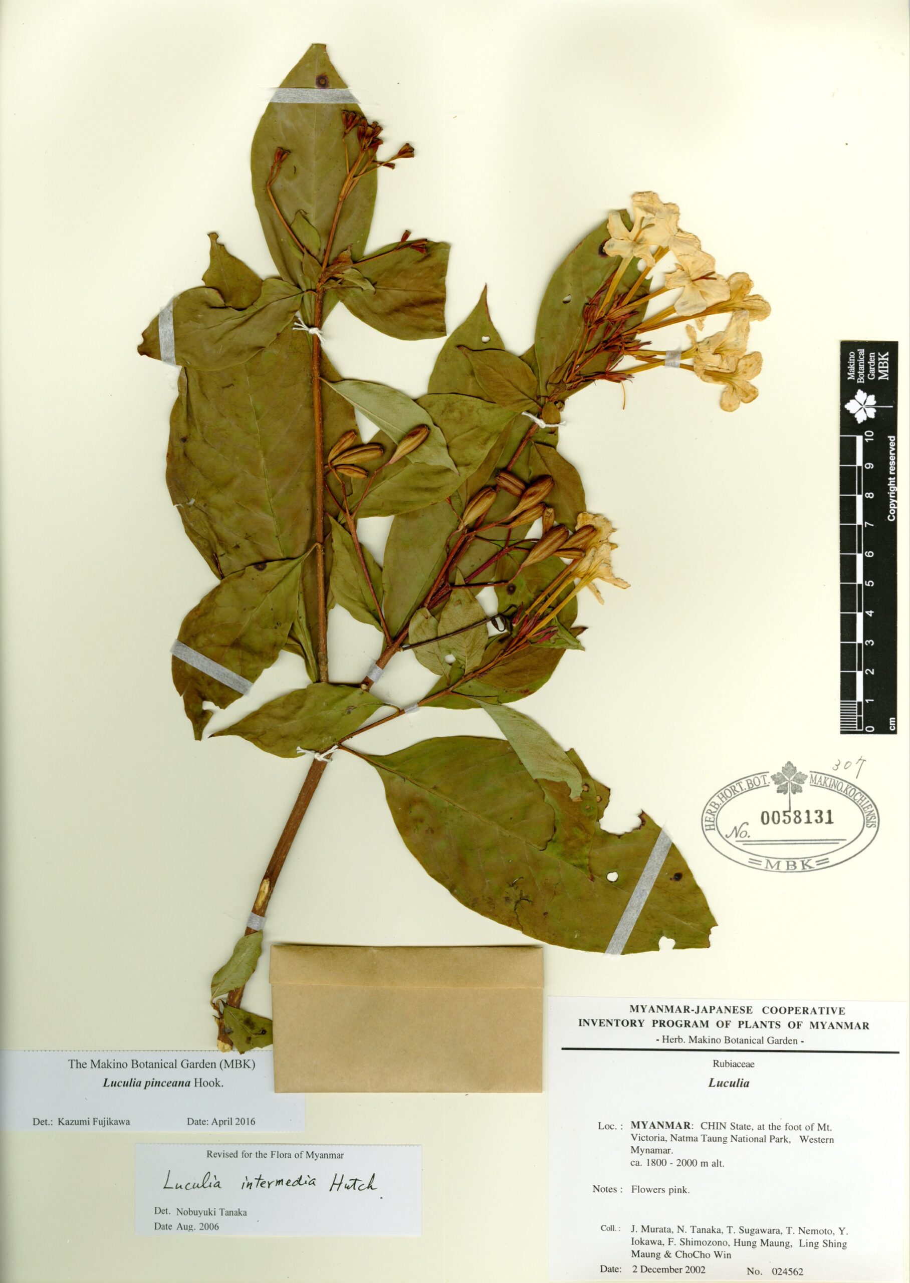 Rubiaceae | Luculia pinceana Hook. | MYANMAR: CHIN State, at the foot of Mt. Victoria, Natma Taung National Park, Western Myanmar. | 2 December 2002 | J. Murata, N. Tanaka, T. Sugawara, T. Nemoto, Y. Iokawa, F. Shimozono, Hung Maung, Ling Shing Maung & Cho Cho Win; | 024562 | 0058131 |
