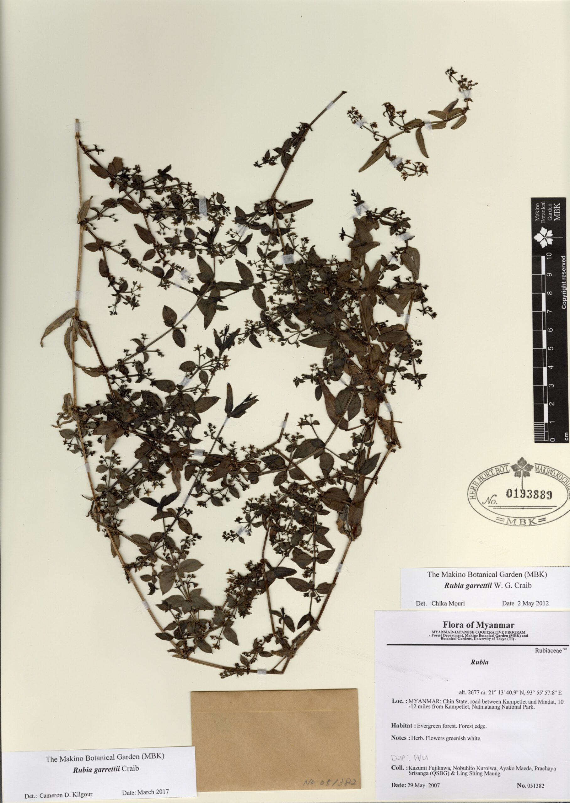 Rubiaceae | Rubia garrettii Craib | MYANMAR: Chin State; road between Kampetlet and Mindat, 10-12 miles from Kampetlet, Natmataung National Park. | 29 May 2007 | Kazumi Fujikawa, Nobuhito Kuroiwa, Ayako Maeda, Prachaya Srisanga (QSBG) & Ling Shing Maung; | 051382 | 0193889 |