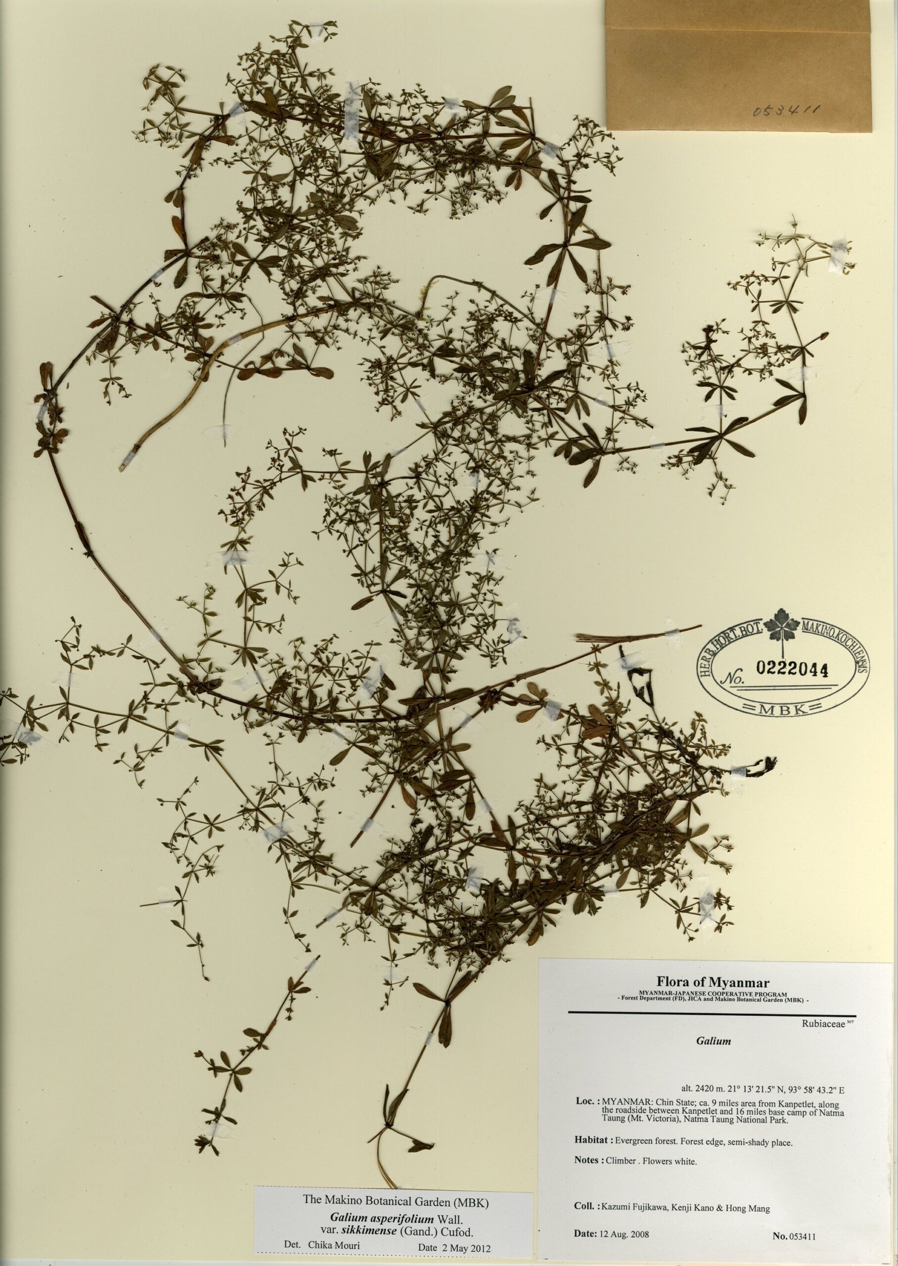 Rubiaceae | Galium asperifolium Wall. var. sikkimense (Gand.) Cufod. | MYANMAR: CHIN State; ca. 9 miles area from Kanpetlet, along the roadside between Kanpetlet and 16 miles base camp of Natma Taung (Mt. Victoria), Natma Taung National Park. | 12 August 2008 | Kazumi Fujikawa, Kenji Kano & Hong Mang; | 053411 | 0222044 |