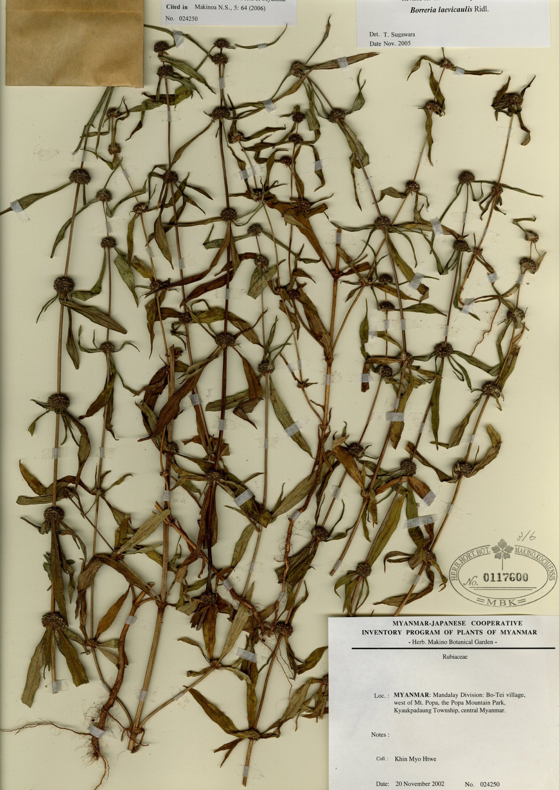 Rubiaceae | Spermacoce pusilla Wall. | MYANMAR: Mandalay Division: Bo-Tei village, west of Mt. Popa, the Popa Mountain Park, Kyaukpadaung Township, central Myanmar. | 20 November 2002 | Khin Myo Htwe; | 024250 | 0117600 |