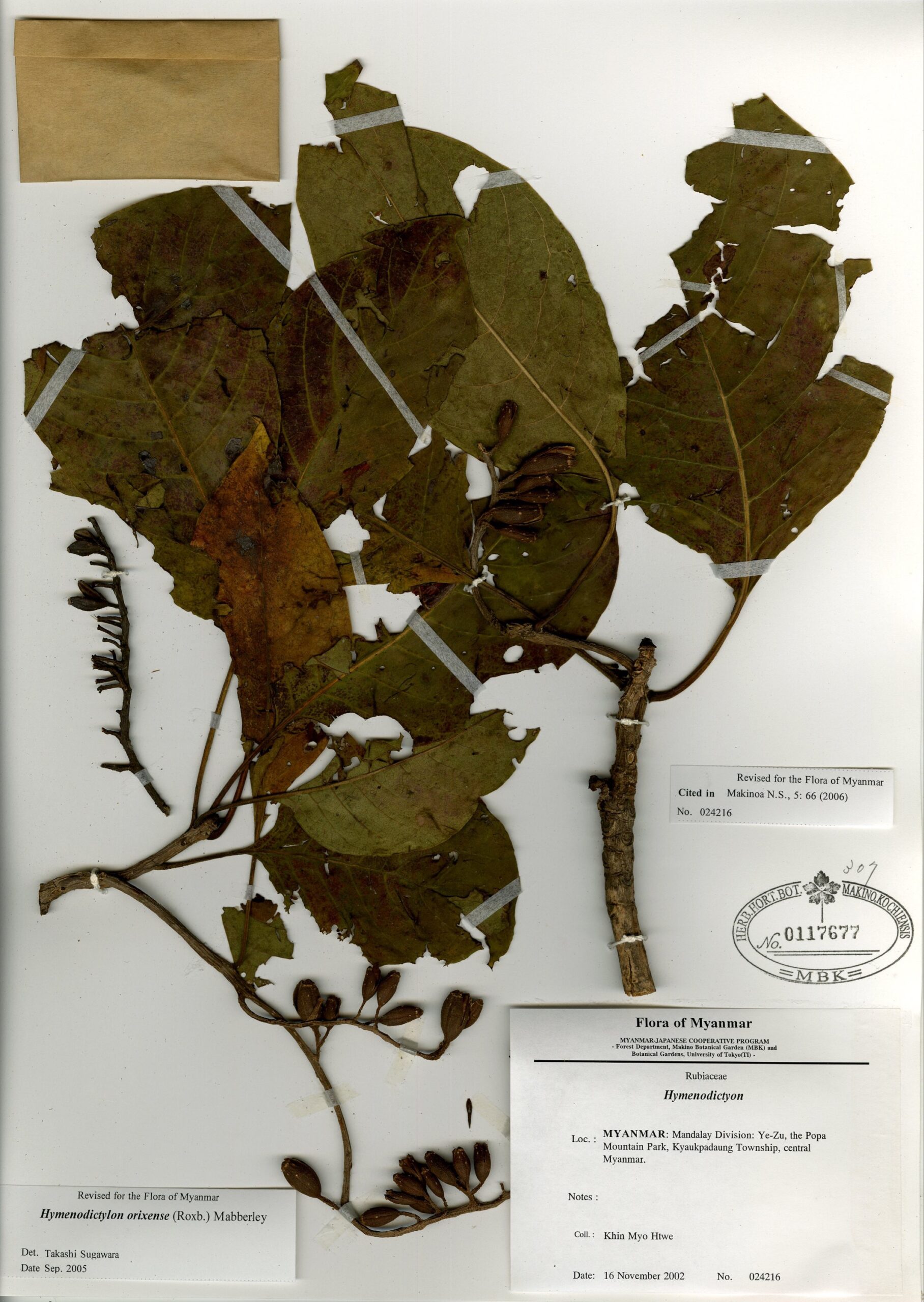 Rubiaceae | Hymenodictyon orixense (Roxb.) Mabberley | MYANMAR: Mandalay Division: Ye-Zu, the Popa Mountain Park, Kyaukpadaung Township, central Myanmar. | 16 November 2002 | Khin Myo Htwe; | 024216 | 0117677 |