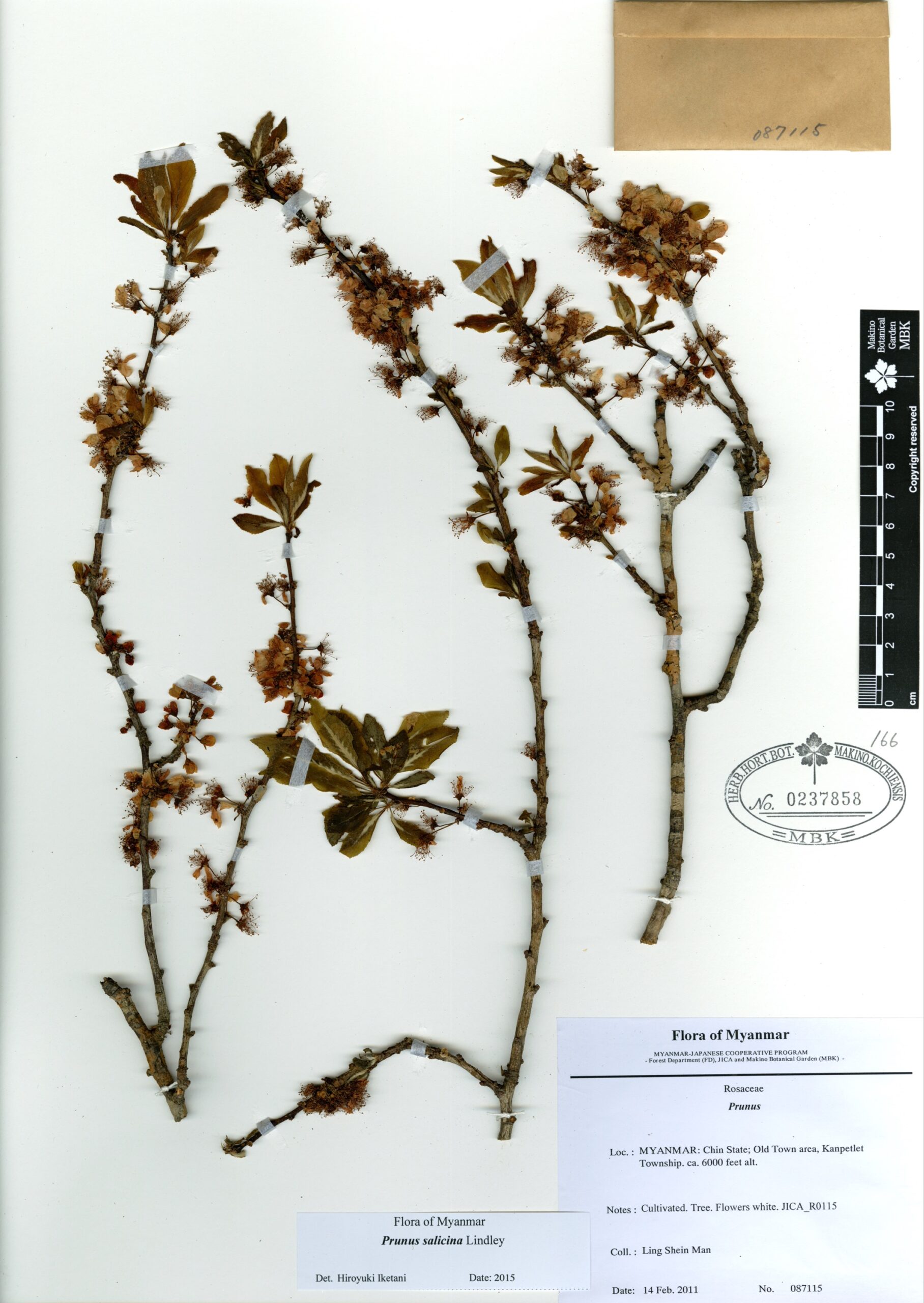 Rosaceae | Prunus salicina Lindley | MYANMAR: Chin State; Old Town area, Kanpetlet Township. | 14 February 2011 | Ling Shein Man; | 087115 | 0237858 |