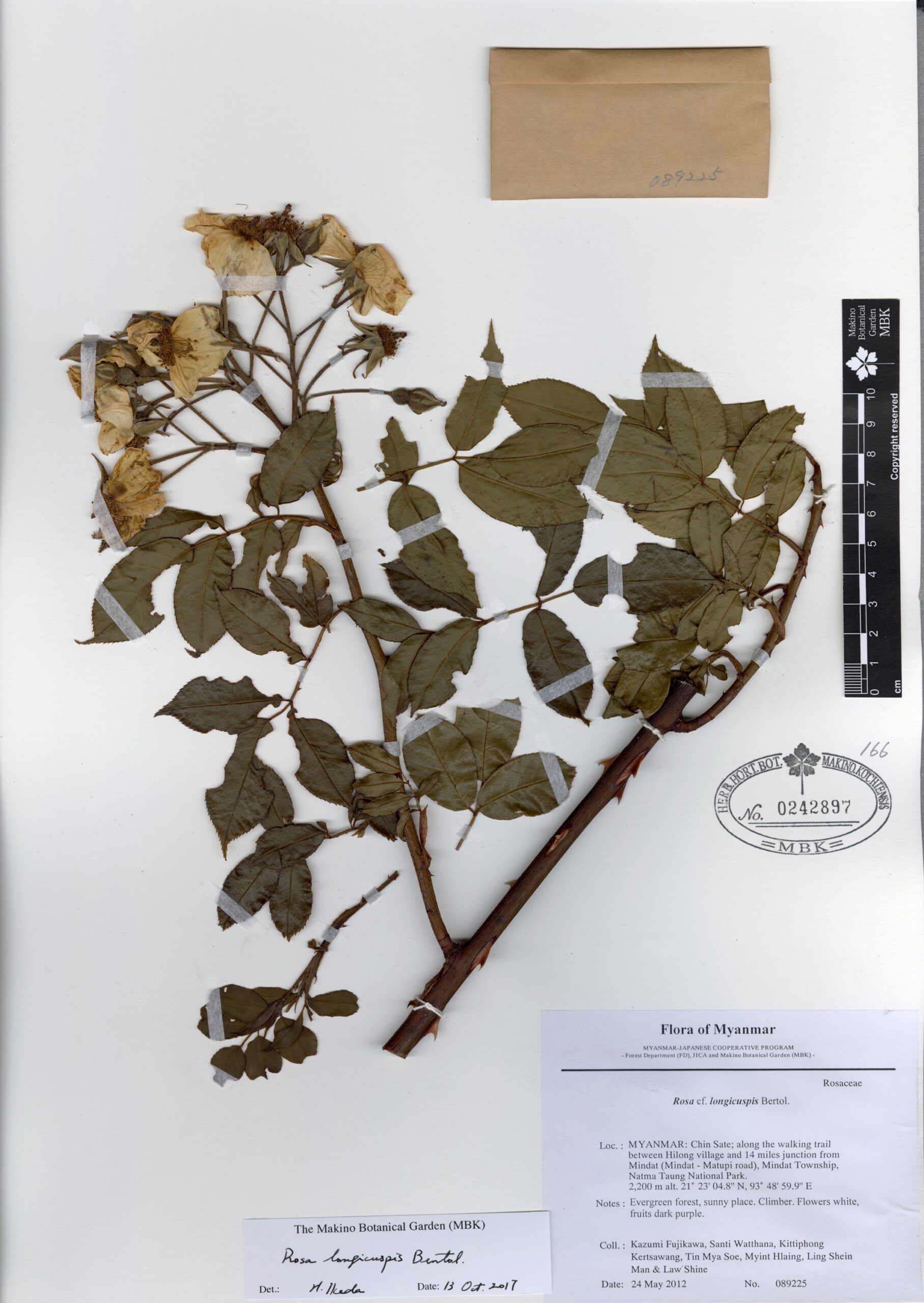 Rosaceae | Rosa longicuspis Bertol. | MYANMAR: Chin State; along the walking trail between Hilong village and 14 miles junction from Mindat (Mindat-Matupi road), Mindat Township, Natma Taung National Park. | 24 May 2012 | Kazumi Fujikawa, Santi Watthana, Kittiphong Kertsawang, Tin Mya Soe, Myint Hlaing, Ling Shein Man & Law Shine; | 089225 | 0242897 |